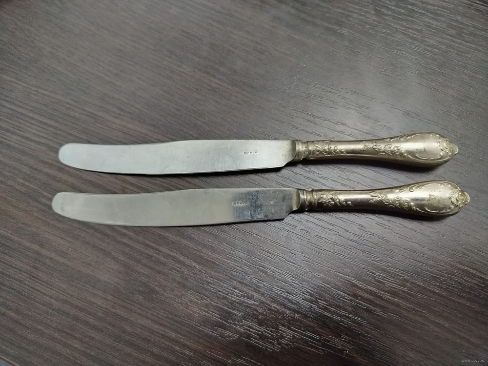Два ножа с растительным декором мельхиор ( медь никель) , лезвие нержавейка , Вольнянский завод столовых приборов . ( ЗиШ ) , СССР , 1950-1980 гг.