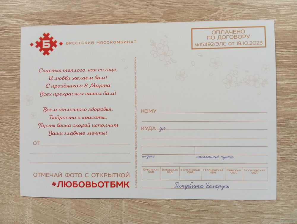 О-12. ПОДПИСАННАЯ ОТКРЫТКА. БРЕСТСКИЙ МЯСОКОМБИНАТ. С ПРАЗДНИКОМ 8 МАРТА.