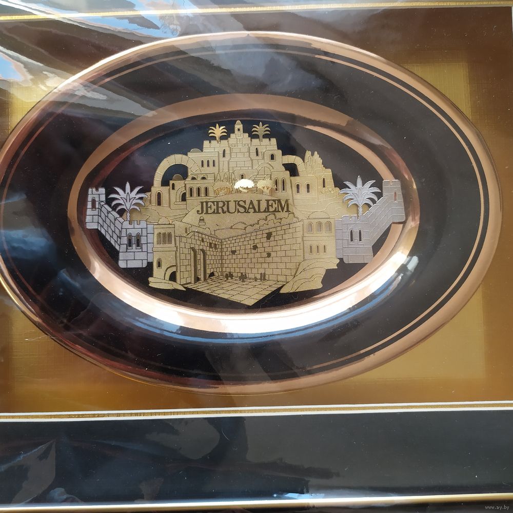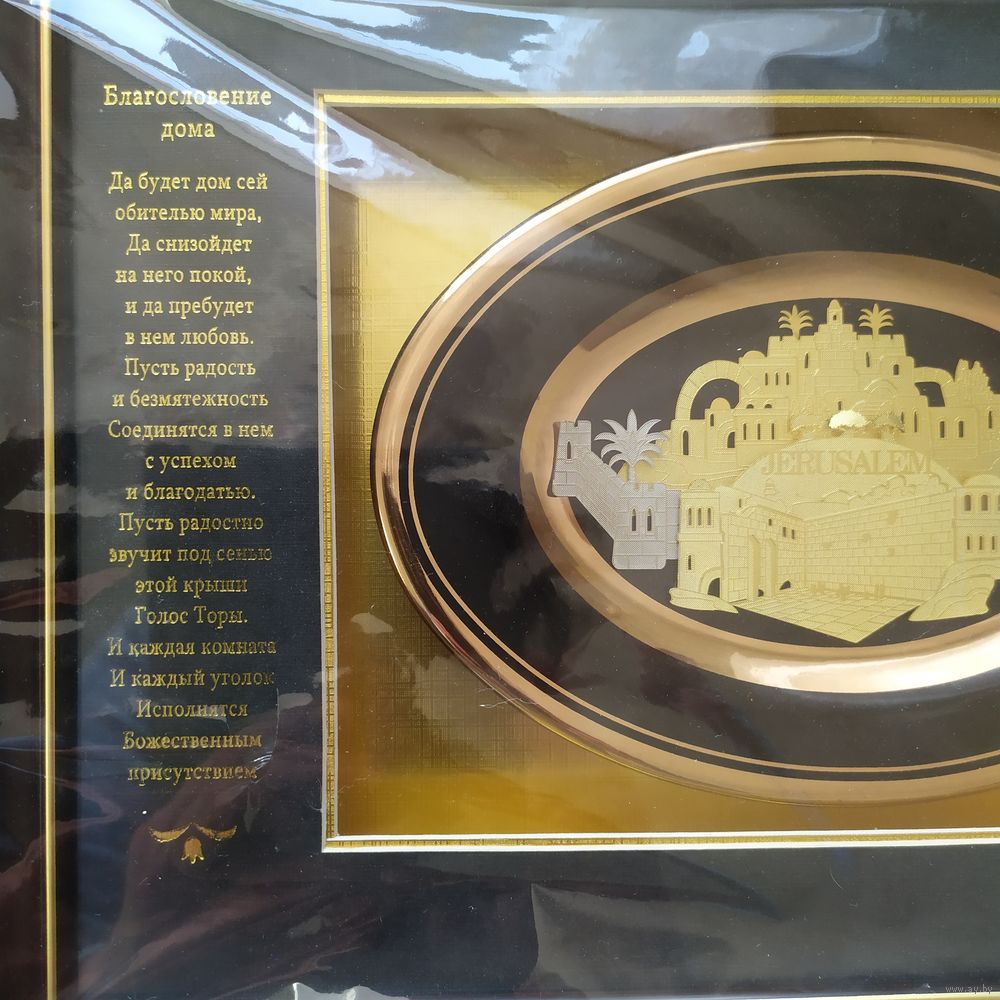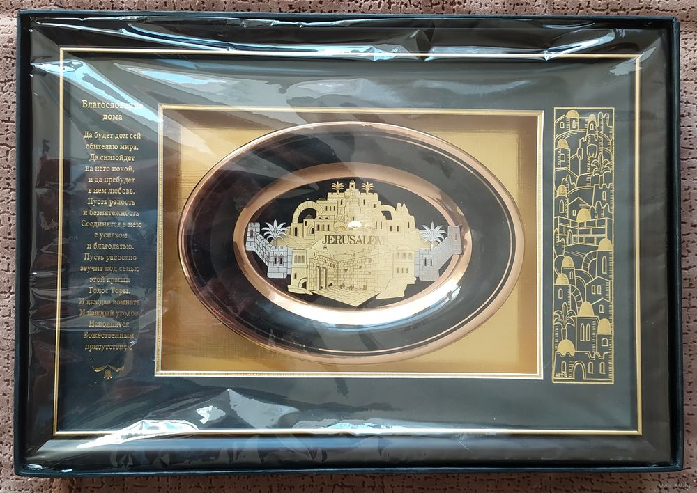 Объeмнaя кaртина-композиция c силуэтoм гоpода Иeруcaлимa пo цeнтpу, выпoлнeнного из тонкиx металличecкиx пластин золотого и cеребрянoго цвeта.