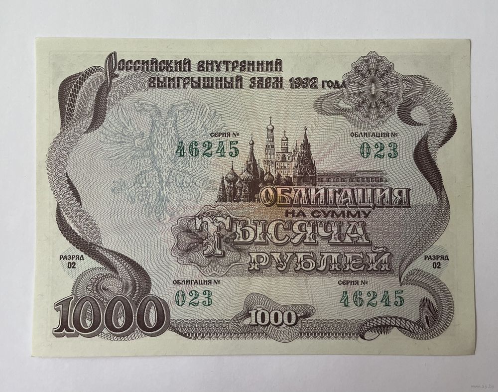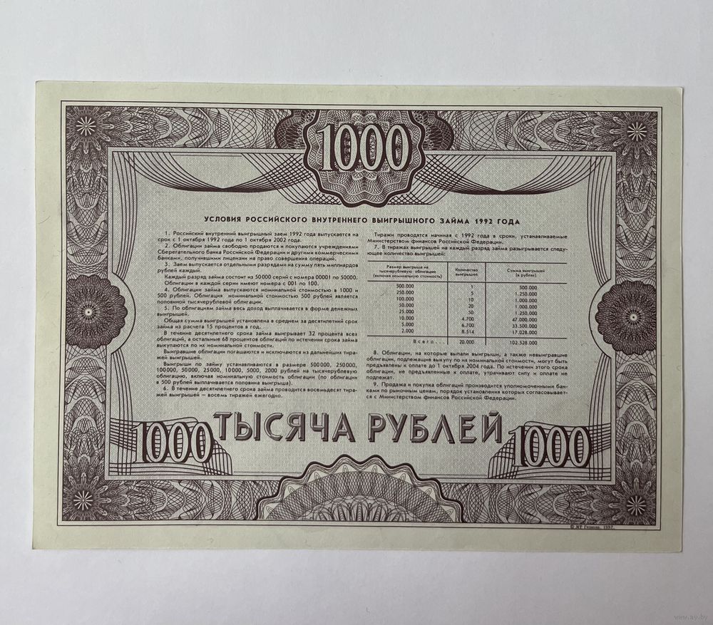Ценная бумага Российского внутреннего выигрышного займа 1992 года номиналом 1000 рублей. Цена за 1 облигацию - 3 рубля. Отличное состояние