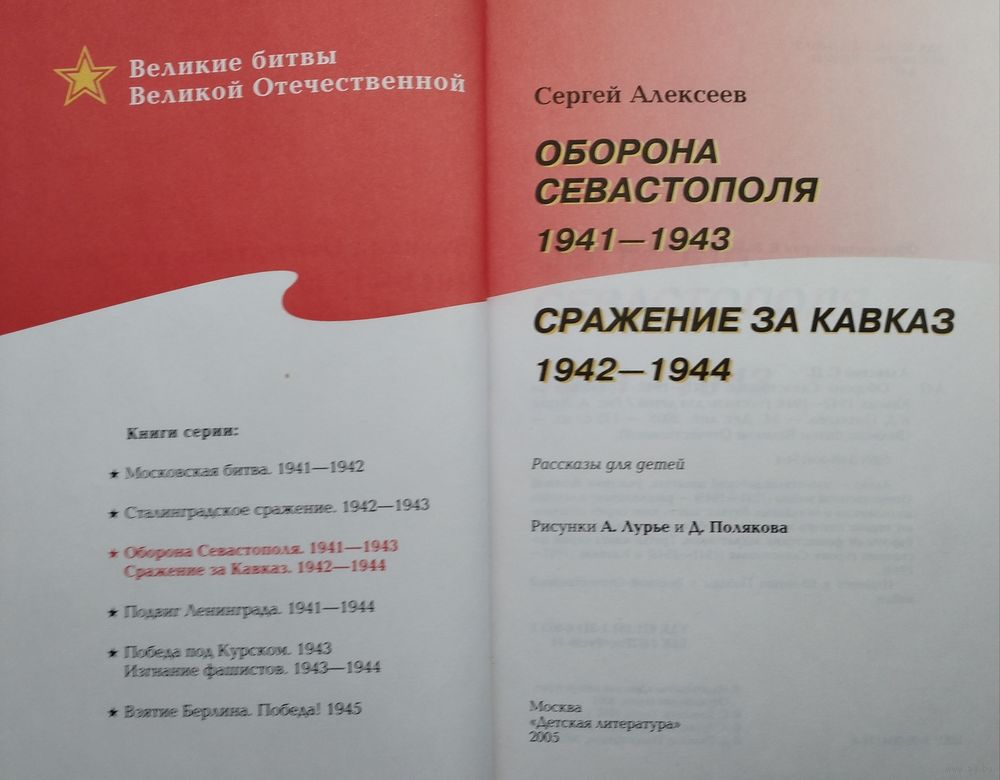 Большой энциклопедический формат. Тираж 5000 экз. 178 стр. Автор – известный детский писатель, участник Великой Отечественной войны (1941-1945) – рассказывает младшим школьникам о ее главных битвах: шесть книг серии описывают подвиг нашего народа в освобождении родной страны и Европы от фашистских захватчиков. Третья книга серии посвящена героям Севастополя (1941-1943) и Кавказа (1942-1944).