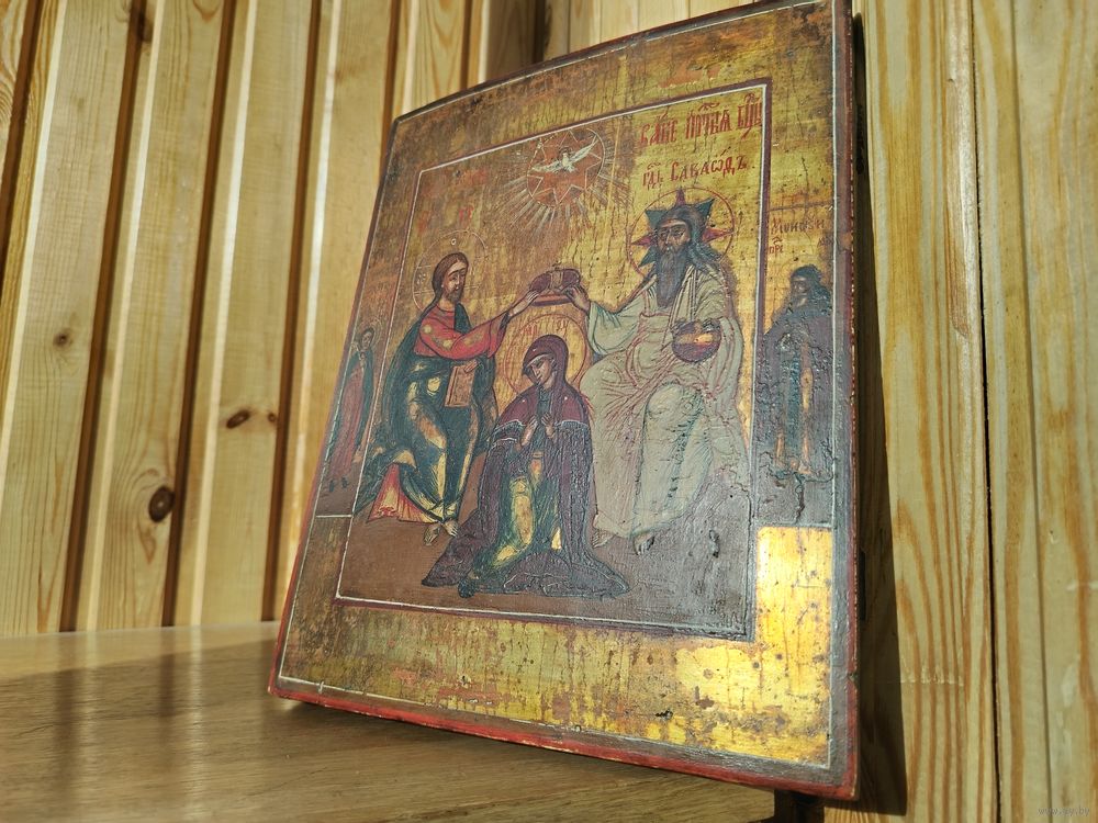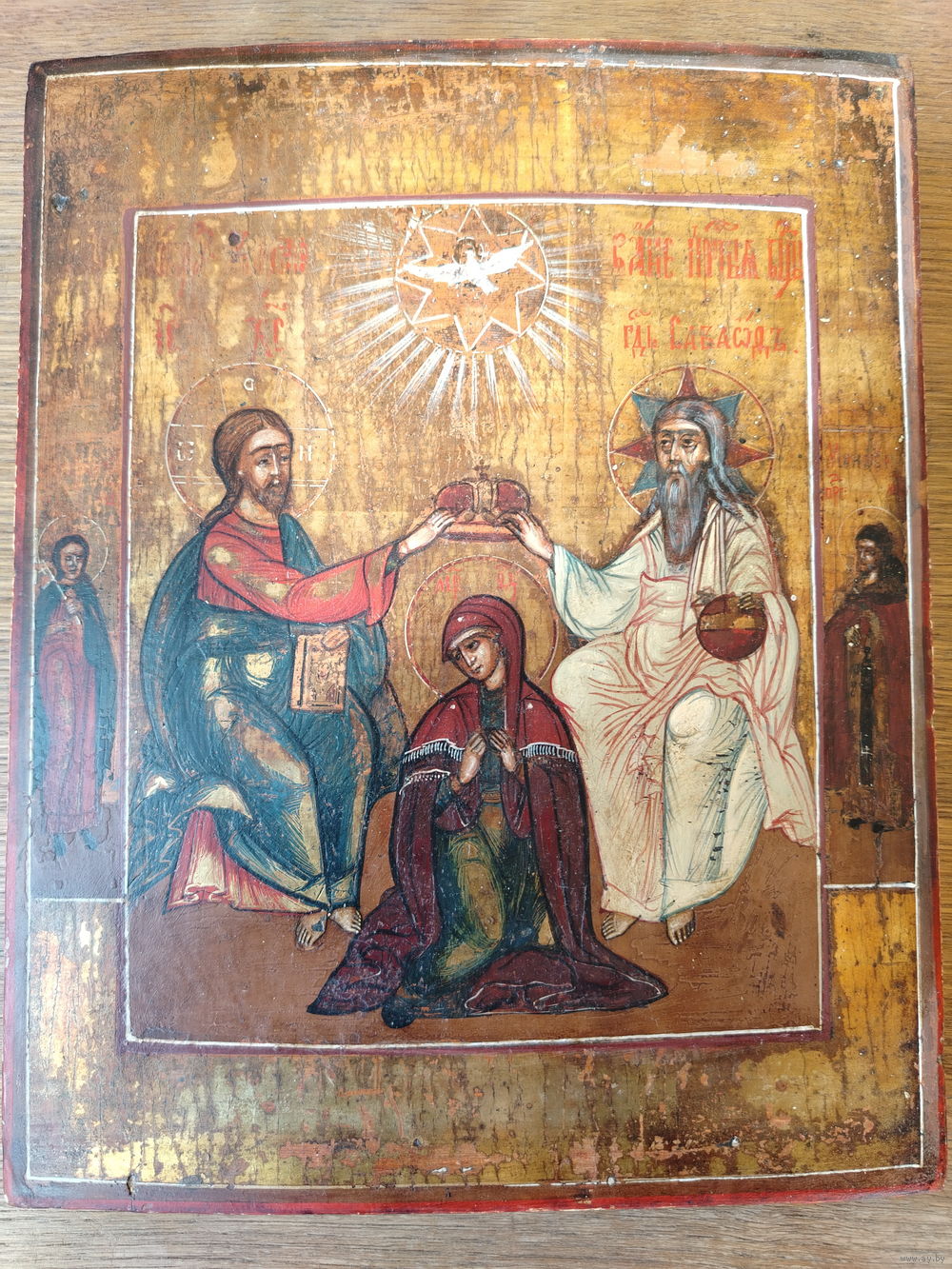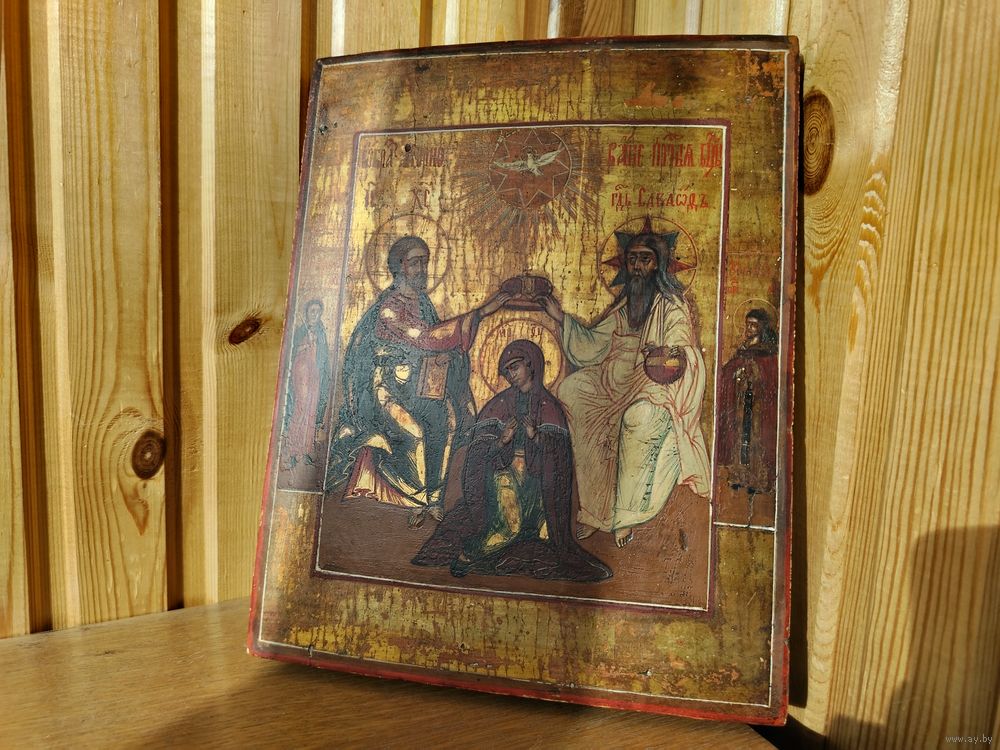 Старинная икона "Коронация Пресвятой Богородицы" — редкий почитаемый образ, прославляющий Богоматерь как Царицу Небесную и Заступницу всех верующих.