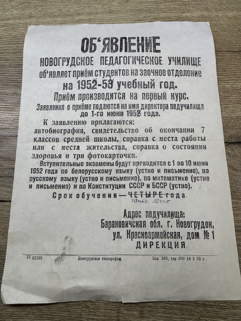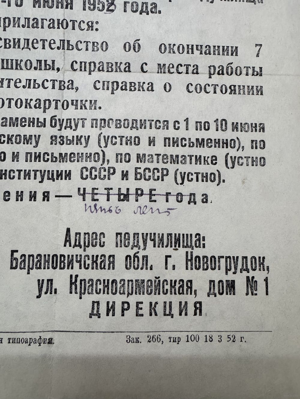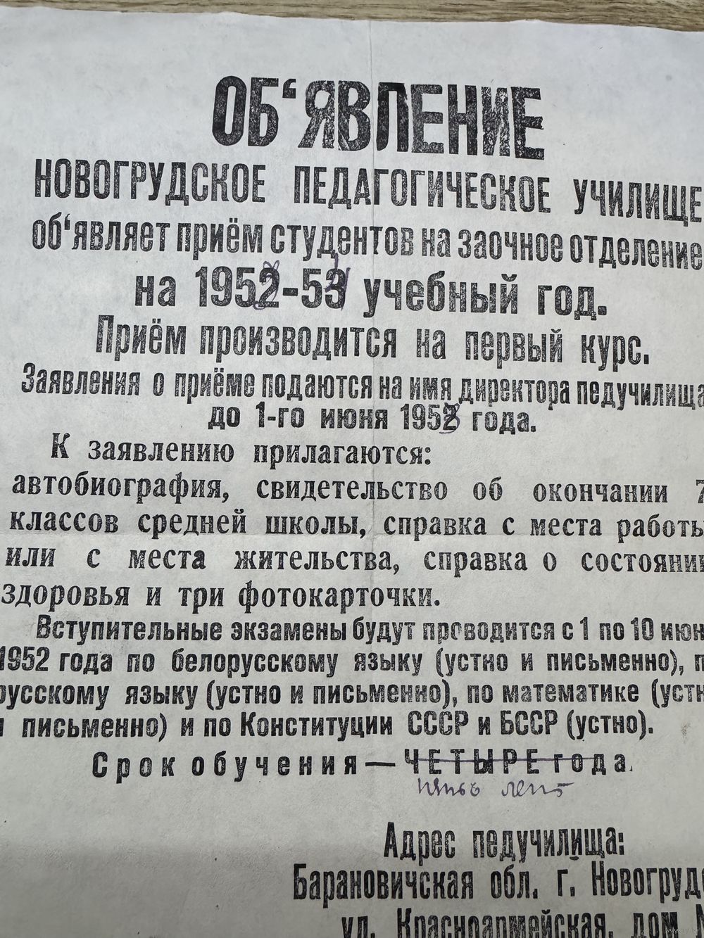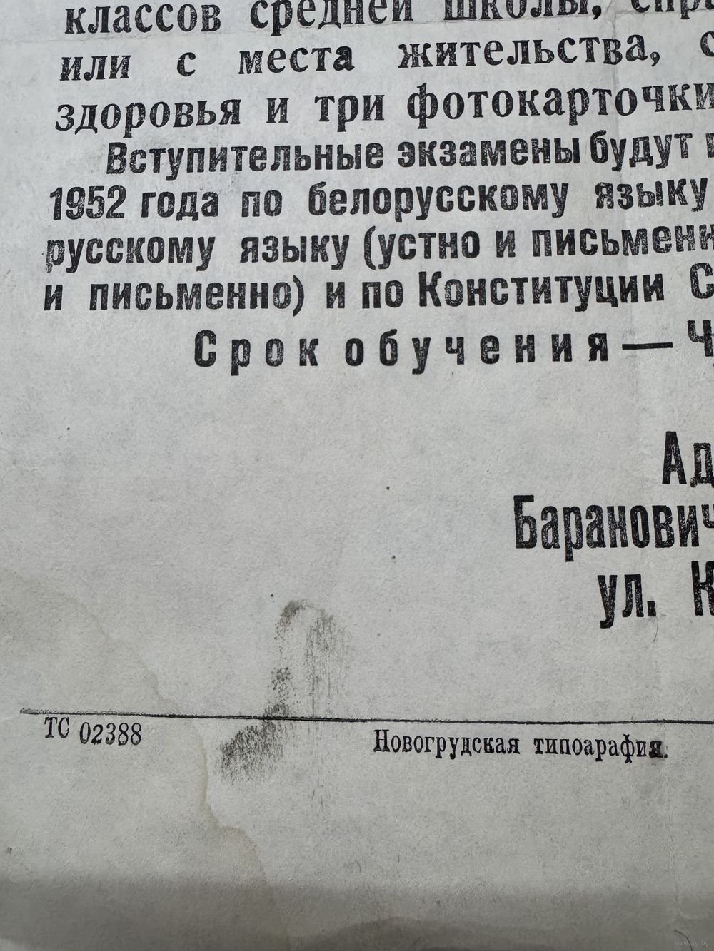 Объявление.Новогрудок-педучилище.1952г.