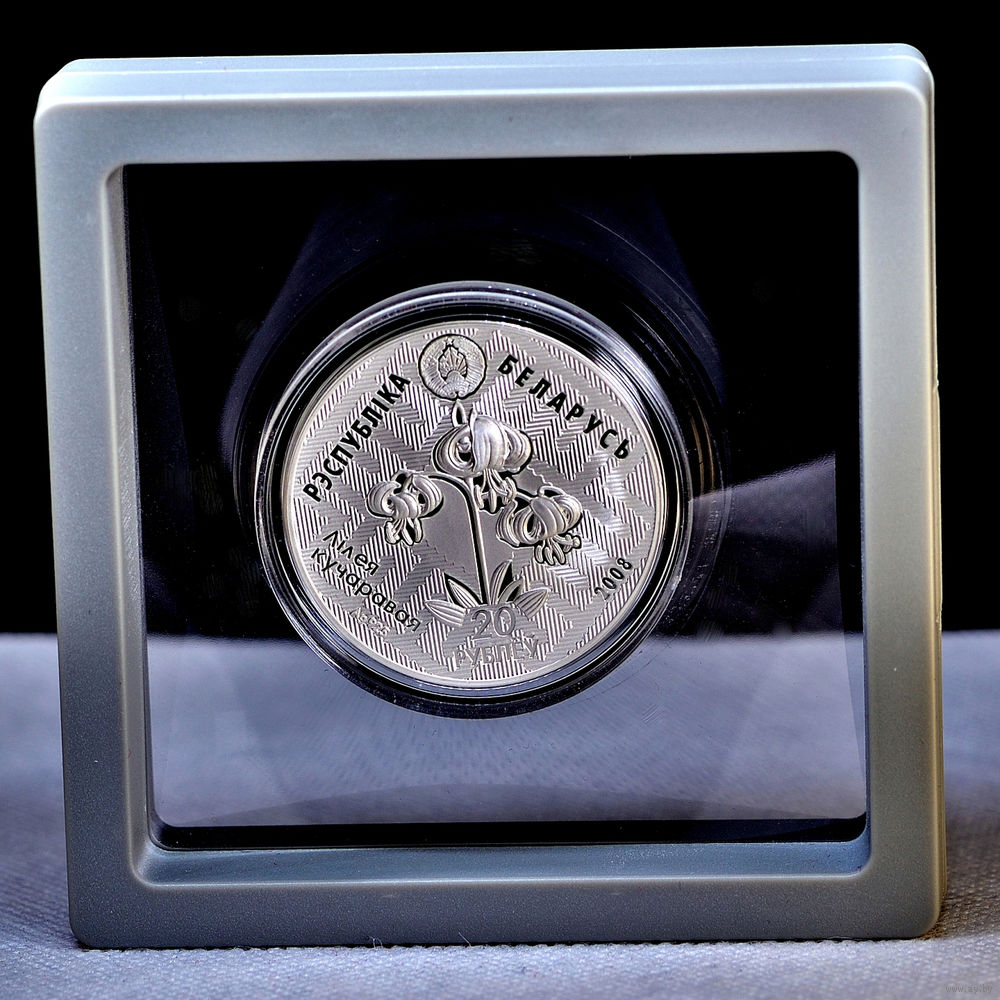 вверху – рельефное изображение Государственного герба Республики Беларусь и надпись: РЭСПУБЛІКА БЕЛАРУСЬ; в центре – изображение цветущего растения; под ним номинал: 20 РУБЛЁЎ (на серебряной) и 1 РУБЕЛЬ (на медно – никелевой); слева надпись: ЛІЛЕЯ КУЧАРАВАЯ и проба сплава (на серебряной); справа – год чеканки.