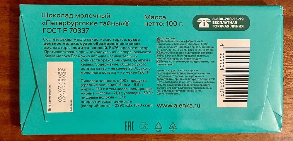 Обёртка от шоколада "Петербургские тайны" Россия Красный Октябрь