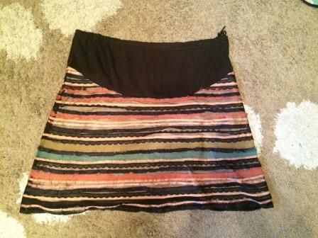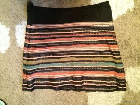 Очаровательная интересная юбка на 56 размер. Можно для беременной. БУ, хорошо бу. Состояние среднее, но из-за яркости юбки мелкие дефекты в глаза не бросаются. ПОталии57см, длина59см.