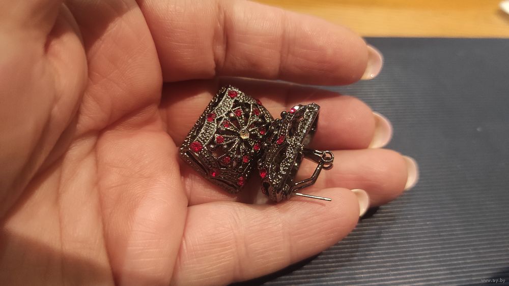 Фото 3-4. Шикарные серьги из темного металла с камнями цвета бордо. Размер 2,5 на 2,5 см. Очень красиво смотрятся. Цена 20,00