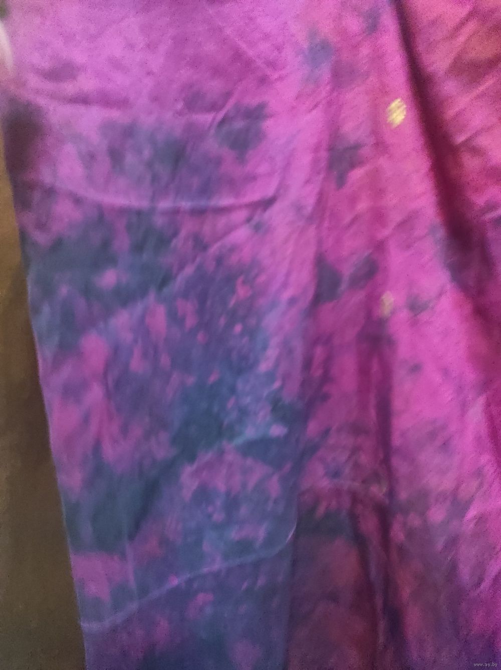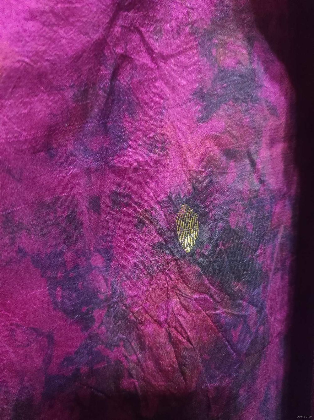 Очень красивый палантин/шаль насыщенного цвета: фуксия + баклажан. По составу ткани не скажу, но очень приятная на ощупь, жатая, не требует глажки. С красивыми вышитыми золотыми листиками. Размер 165 см.