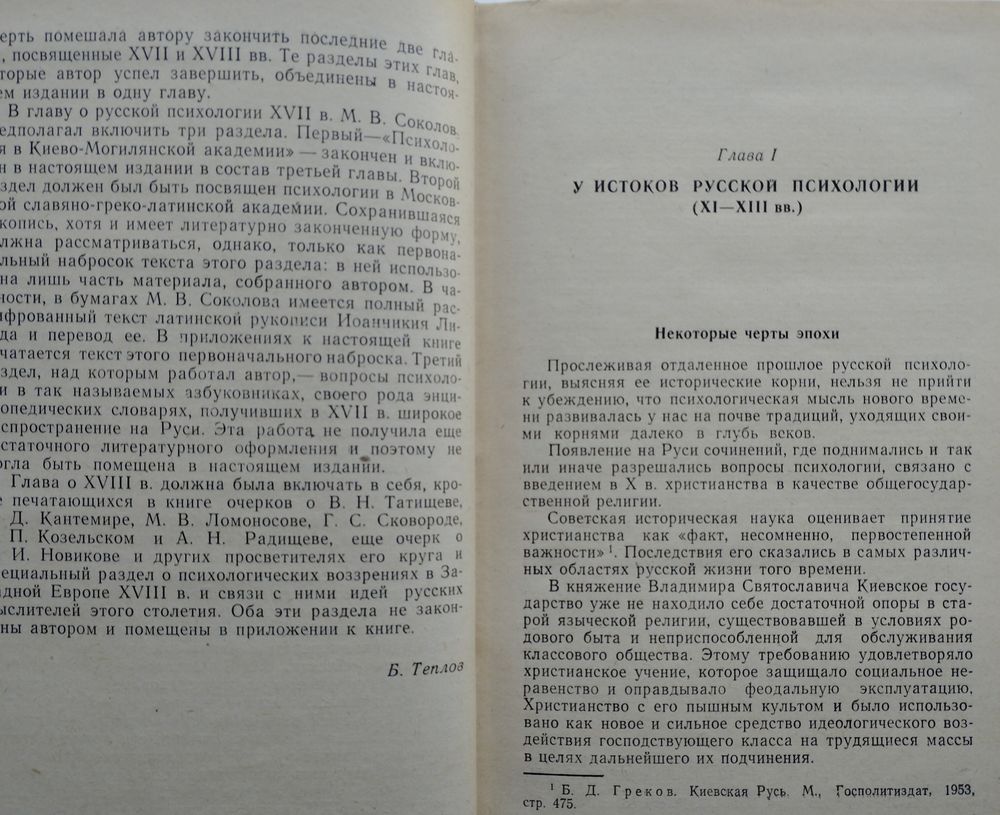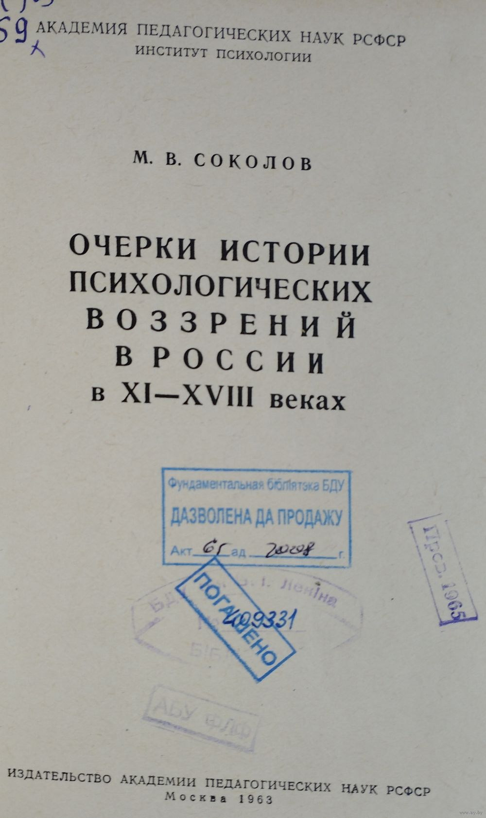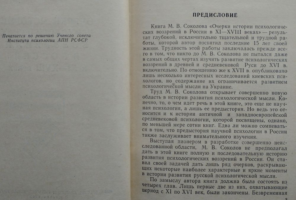 Большой формат. Тираж 2500 экз. 428 стр. Книга Михаила Васильевича Соколова «Очерки истории психологических воззрений в России в XI—XVIII веках» — результат глубокой, исключительно тщательной и трудной работы, которой автор посвятил последние 15 лет своей жизни. Труд Соколова открывает совершенно новую область в истории развития мировой психологической мысли. Есть штампы.