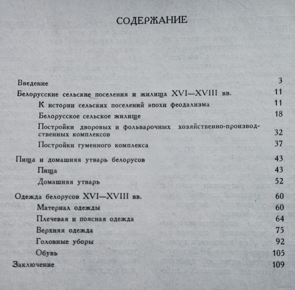 В книге на материале письменных памятников XVI — XVIII вв. исследуются типы жилища. хозяйственно-производственные постройки, пища, домашняя утварь, виды и типы покроя одежды, головные уборы, обувь белорусов эпохи феодализма. При характеристике различных сторон быта подчеркиваются дифференциация, имущественное неравенство различных слоев белорусского общества. Доказывается, что материальная культура белорусов XVI — XVIII вв., с одной стороны, сохраняла черты, сформировавшиеся в древнерусский период, с другой—развивалась под влиянием западноевропейской культуры, что особенно ярко отразилось на быте магнатских слоев и меньше всего сказалось на материальной культуре простого народа, сохранившего древние элементы культуры вплоть до начала XX в.