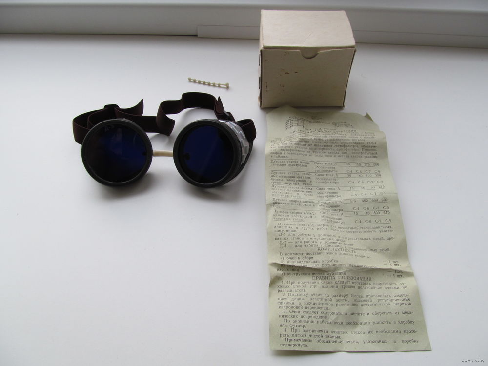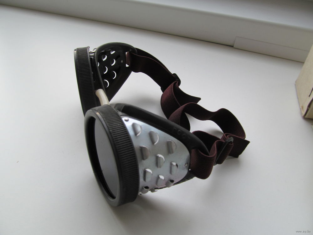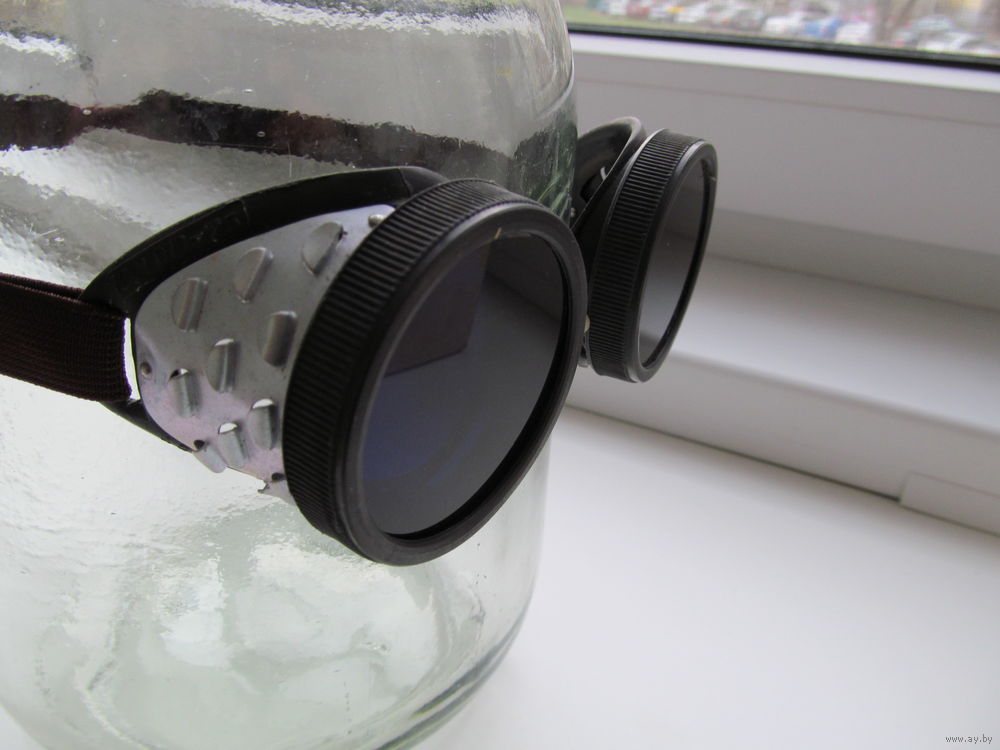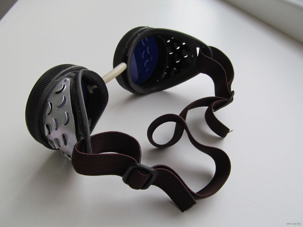 Защитные очки с непрямой вентиляцией, минеральные стекла-фильтры, маркировка Д-3 (для работы в литейных цехах и у стекловаренных печей) цвет фильтров темно-синий. Материал оправы: металл, пластик. Регулируемые лямки.