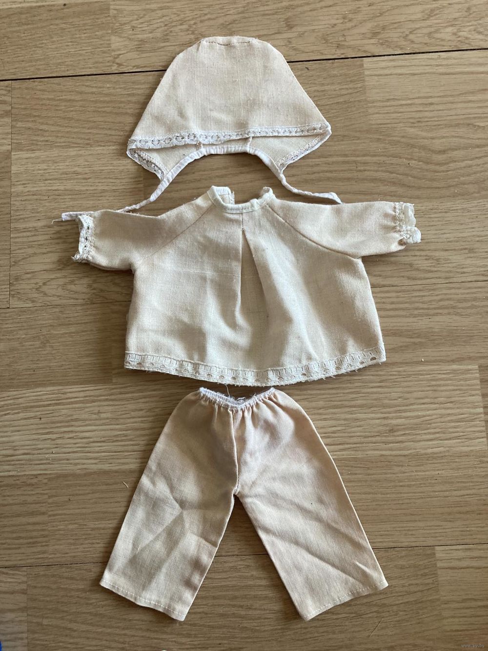 Комплект одежды для кукол: кофточка, брючки, шапочка. Материал лен. Цена лота 15 руб. Отправлю почтой.