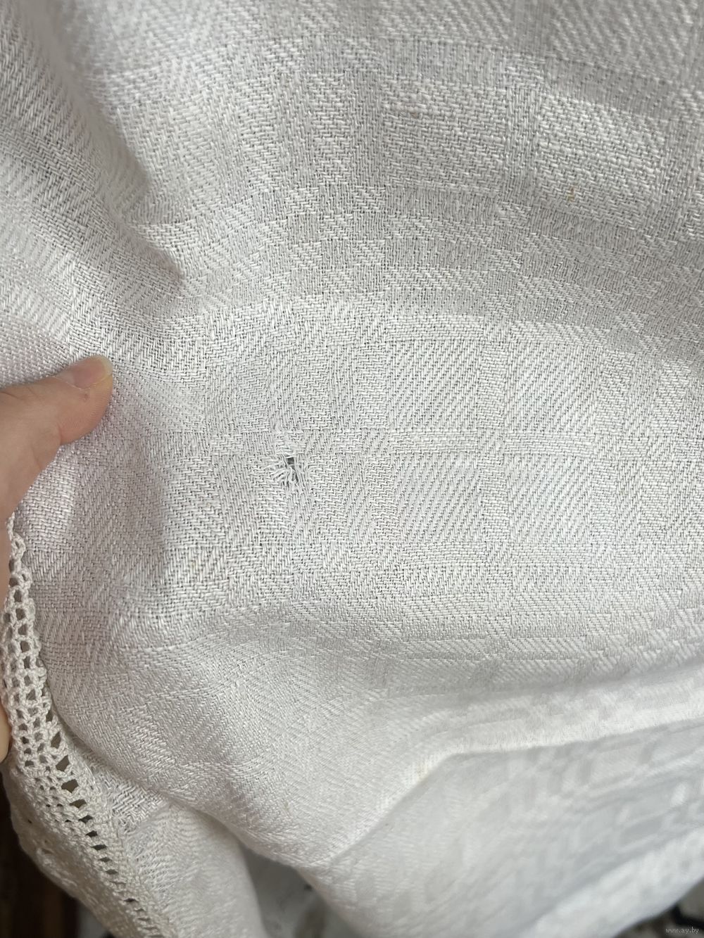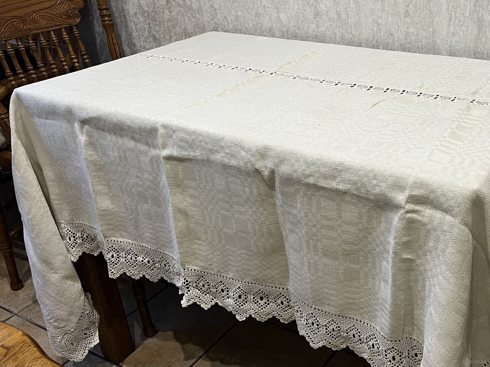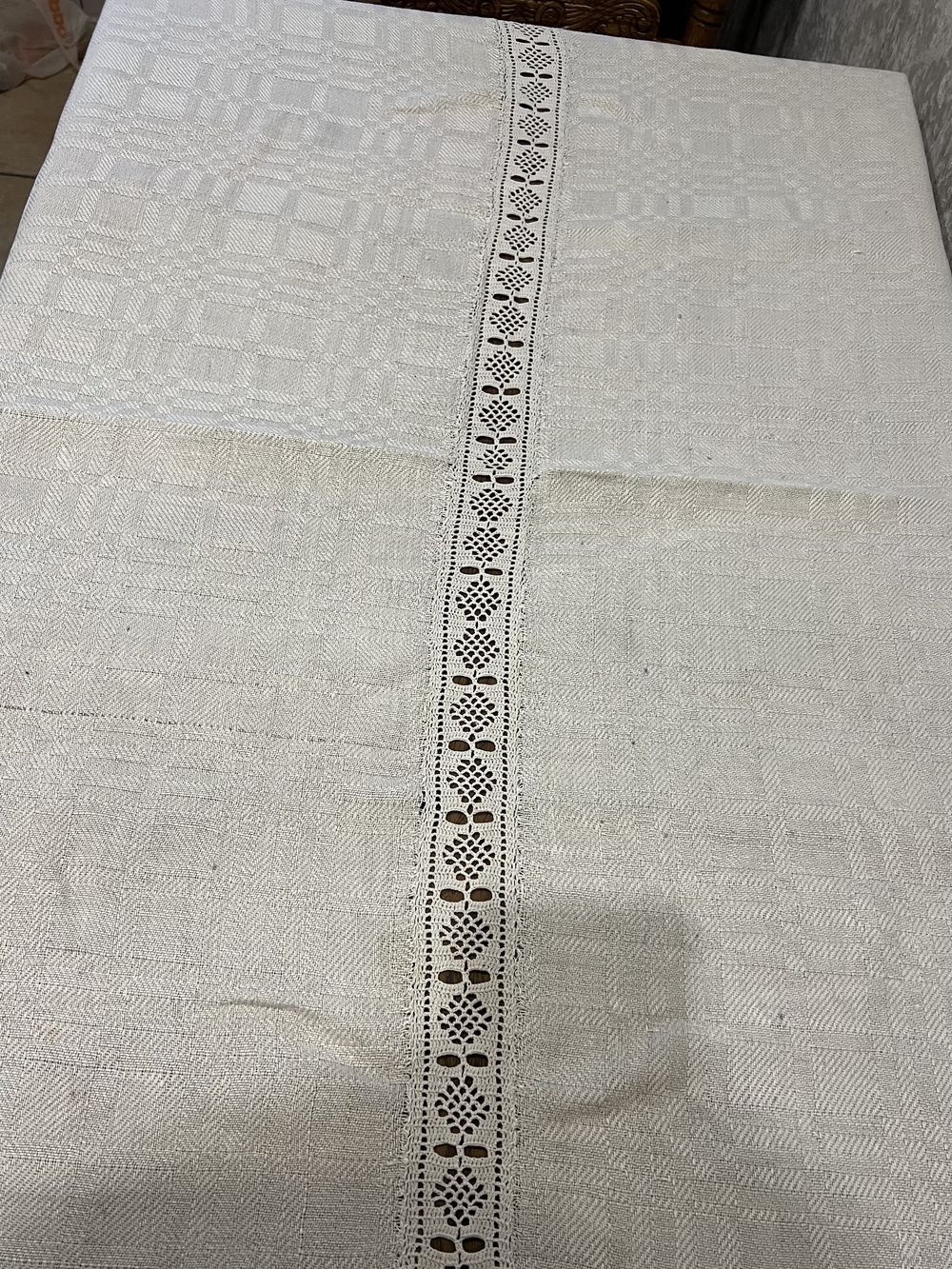 Огромная старинная домотканая скатерть с кружевом ручной работы по центральному шву и по всему периметру.