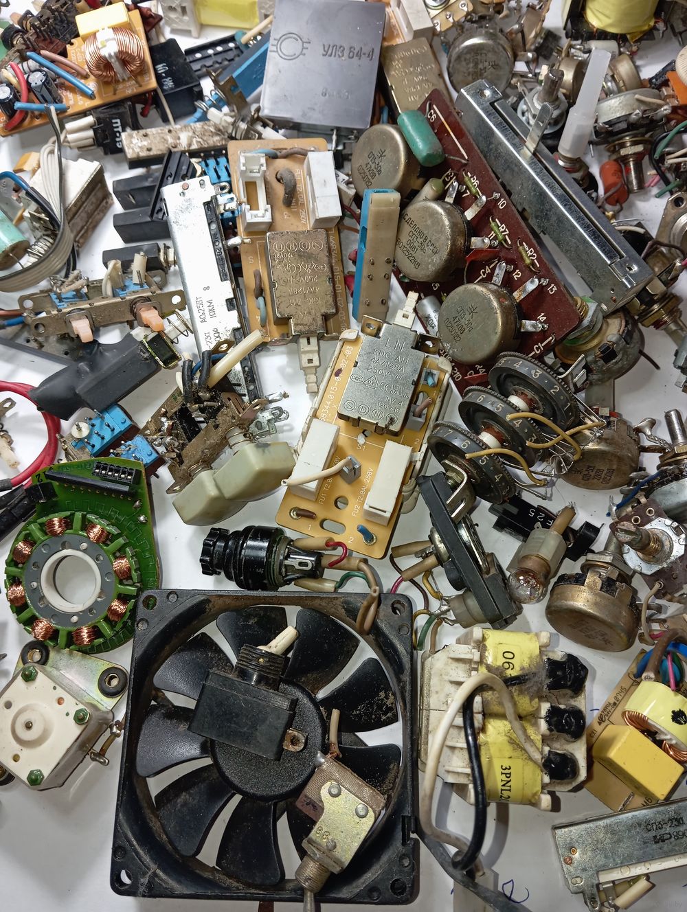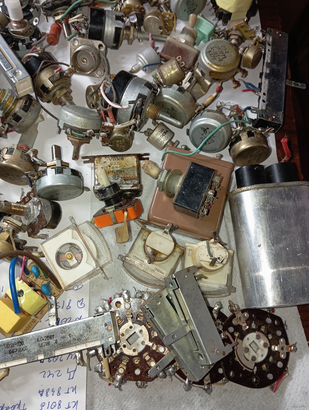Огромный лот радиодеталей резисторы , трансформаторы , кнопки , переключатели и многое другое .