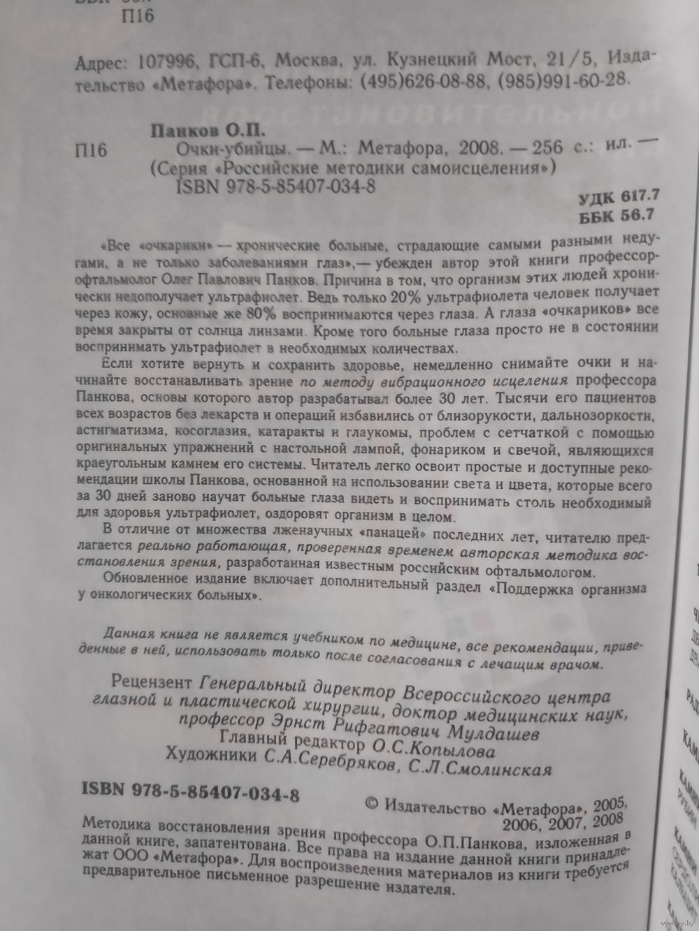 «Все «очкарики» -- хронические больные, страдающие самыми разными недугами, а не только заболеваниями глаз», - убежден автор этой книги профессор- офтальмолог Олег Павлович Панков. Причина в том, что организм этих людей хронически недополучает ультрафиолет. Ведь только 20% ультрафиолета человек получает через кожу, основные же 80% воспринимаются через глаза. А глаза «очкариков» все время закрыты от солнца линзами. Кроме того больные глаза просто не в состоянии воспринимать ультрафиолет в необходимых количествах.Если хотите вернуть и сохранить здоровье, немедленно снимайте очки и начинайте восстанавливать зрение по методи вибрационного исцеления профессора Панкова, основы которого автор разрабатывал более 30 лет. Тысячи его пациентов всех возрастов без лекарств и операций избавились от близорукости, дальнозоркости, астигматизма, косоглазия, катаракты и глаукомы, проблем с сетчаткой с помощью оригинальных упражнений с настольной лампой, фонариком и свечой, являющихся краеугольным камнем его системы. Читатель легко освоит простые и доступные рекомендации школы Панкова, основанной на использовании света и цвета, которые всего за 30 дней заново научат больные глаза видеть и воспринимать столь необходимый для здоровья ультрафиолет, оздоровят организм в целом.В отличие от множества лженаучных «панацей» последних лет, читателю предлагается реально работающая, проверенная временем авторская методика восстановления зрения, разработанная известным российским офтальмологом.Обновленное издание включает дополнительный раздел «Поддержка организма у онкологических больных».Данная книга не является учебником по медицине, все рекомендации, приведенные в ней, использовать только после согласования с лечащим врачом.Рецензент Генеральный директор Всероссийского центра глазной и пластической хирургии, доктор медицинских наук, профессор Эрнст Рифгатович Мулдашев Главный редактор О.С.Копылова Художники С.А.Серебряков, С.Л.Смолинская
