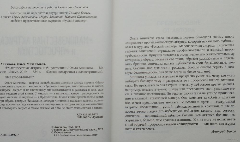 Большой формат. Тираж 2000 экз. 384 стр. Иллюстрации Т. Бесаги и др. Ольга Аничкова – современная российская актриса театра и кино, режиссер, журналистка, писательница, колумнист «Русского пионера». Ольга Аничкова – актриса, полюбившаяся многим в рамках проекта "Малоизвестная актриса", многопланова и многожанрова. Всерьез и по-настоящему она высказывается в рассказах и эссе, ставших сердцем этой книги. С юмором — в пирожках, жанре, пришедшемся по душе многим. И лирично — в Простостихах. В этой книге представлены целых три образа, которые, безусловно, покорят читателя и позволят вдоволь исцеляюще посмеяться над жизненными ситуациями, в которых иногда оказываемся. И поговорить всерьез о самом важном, от чего не стоит отказываться в жизни.