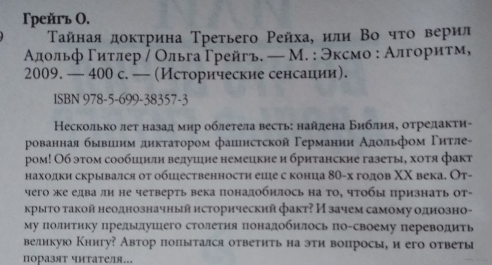 Ольга Грейгъ. Тайная доктрина Третьего Рейха, или во что верил Адольф Гитлер. Москва : Эксмо, Алгоритм, 2009 г. 398 с. Твердый переплет, Обычный формат.