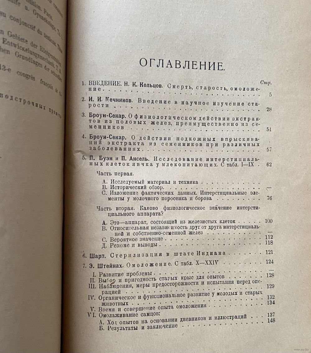 Содержание: Н.К. Кольцов. Смерть, старость, омоложение, И.И. Мечников. Введение в научное изучение старости, Броун-Секар. О физиологическом действии экстрактов из половых желез, преимущественно из семенников, Броун-Секар. О действии подкожных впрыскиваний экстракта из семенников при различных заболеваниях, П. Буэн и П. Ансель. Исследование интерстициальных клеток яичка у млекопитающих, Шарп. Стерилизация в штате Индиана, Э. Штейнах. Омоложение, Е.Пайр. Об операции омоложения по способу Штейнаха. Г.Стиве. Строение, развитие и значение промежуточных клеток зачатковых желез. Э.Реттере и С.Воронов. Мужская половая железа. Указатель литературы. Таблицы.