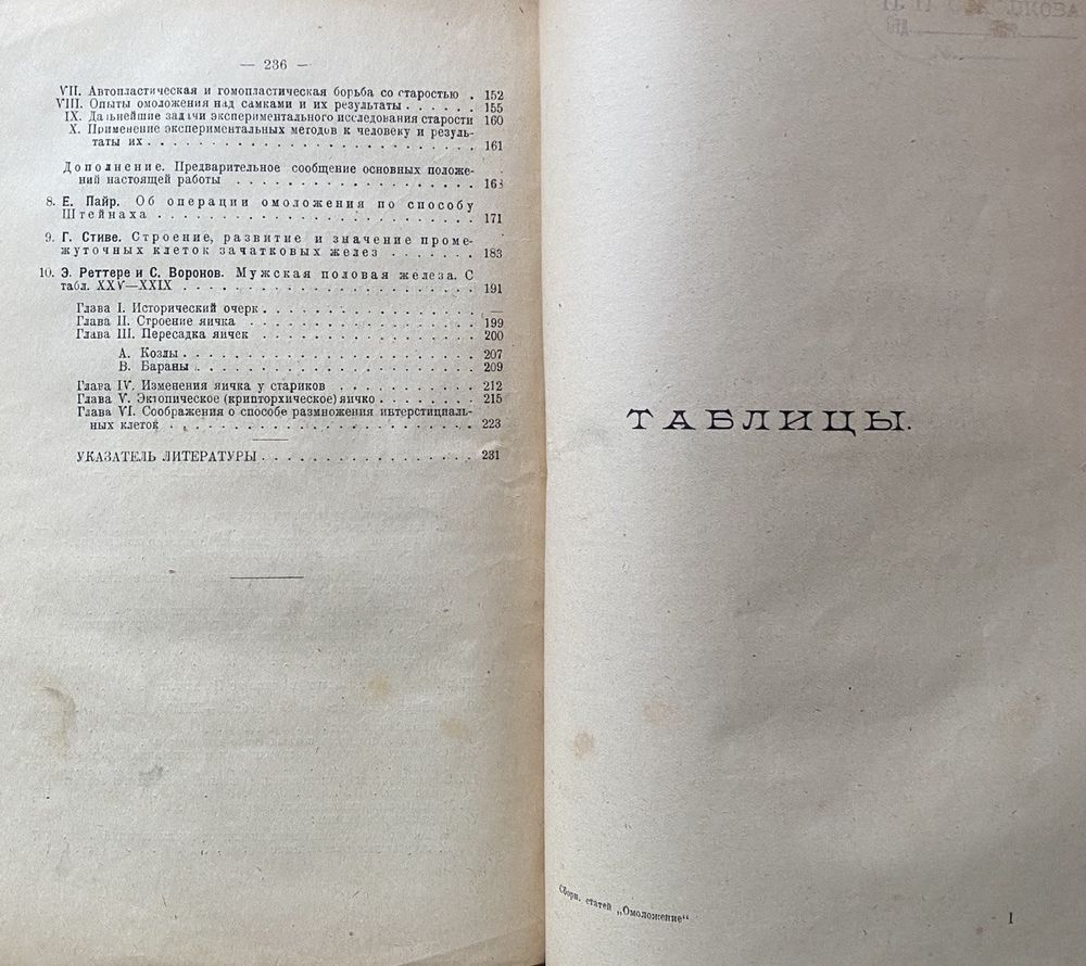 В сборнике «Омоложение» автор собрал главнейшие теоретические работы в области этой проблемы, соединив их исторической связью. Идея Броун-Секара и его первые опыты, послужившие основой для современного грандиозного учения о железах внутренней секреции, подверглись тщательной разработке в особенности в гистологических исследованиях Буэна и Анселя, а затем Штейнаха, заменившего броун-секаровский метод инъекции вытяжек семенника простой аутопластической операцией: перевязкой и перерезкой семенного протока у стареющего организма с целью вызвать усиление эндокринной деятельности яичка. Знакомство со всеми исследованиями, вошедшими в состав сборника, необходимо для всякого, кто желает ознакомиться с проблемой «омоложения» не по популярным изложениям, а по первоисточникам, оно обязательно для врача-хирурга или ветеринара, который желает применить эти методы в своей практике.