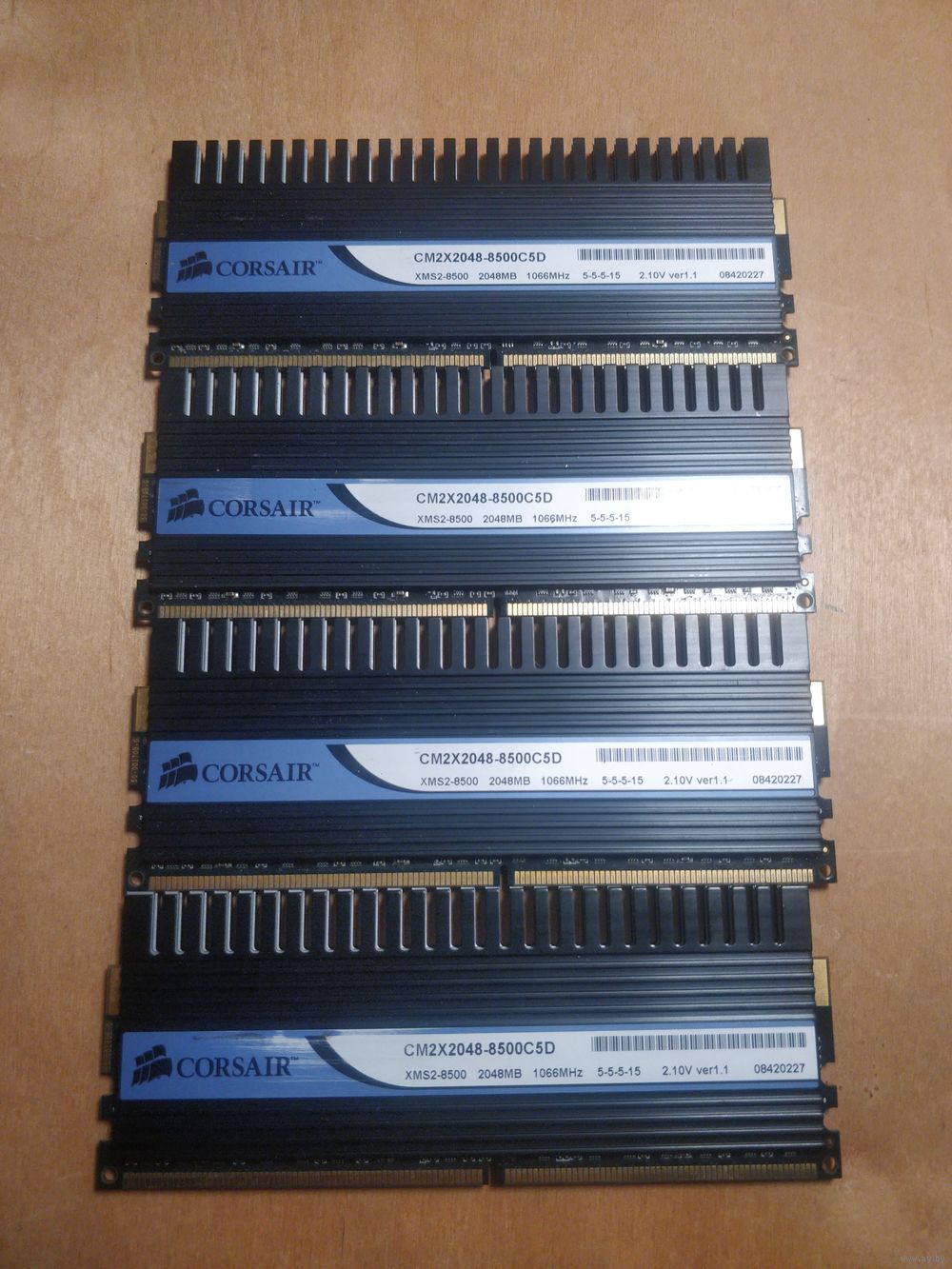 4 модуля 2.1v по 2гб каждый модуль.Топовая оперативная память под DDR2, на самой максимальной штатной частоте, с красивыми, массивными радиаторами. 3 плашки работают отлично, 4тая к сожалению случаянно уронил и компьютером она не определяется
