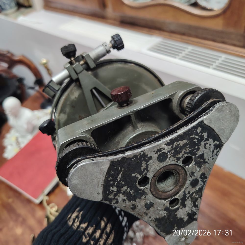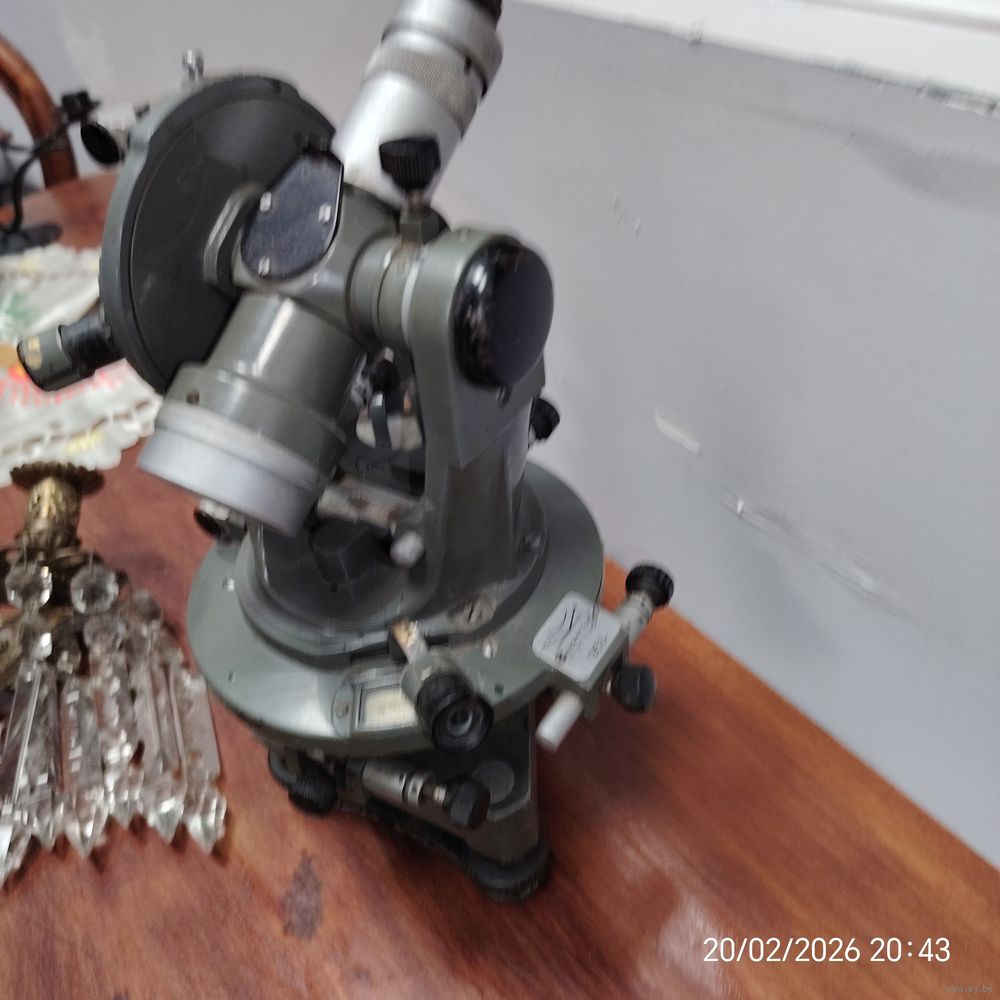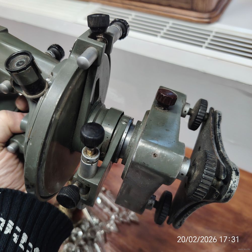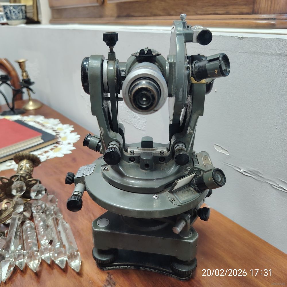 На изображении показан оптический теодолит — геодезический прибор, предназначенный для измерения горизонтальных и вертикальных углов на местности. Такие устройства широко применялись в инженерных изысканиях, строительстве и картографии.