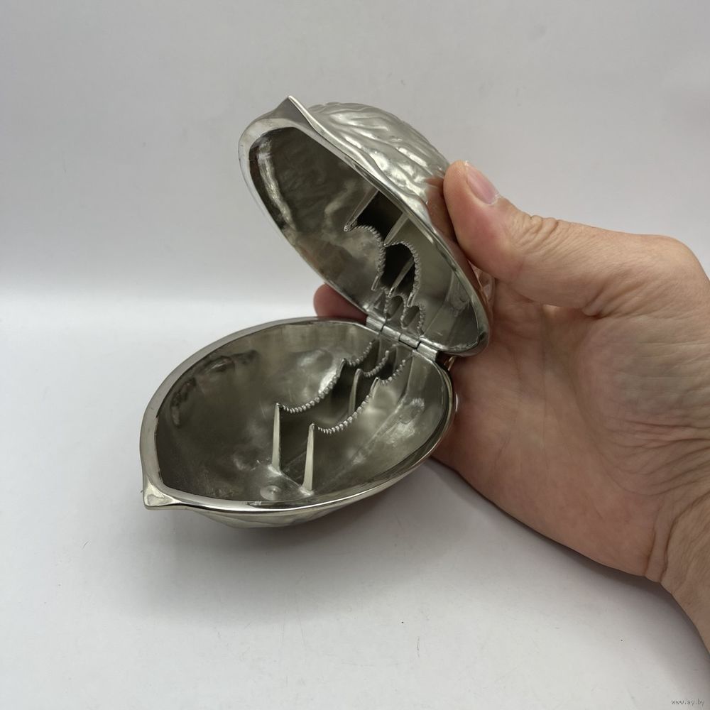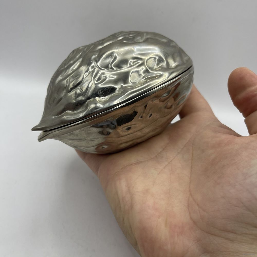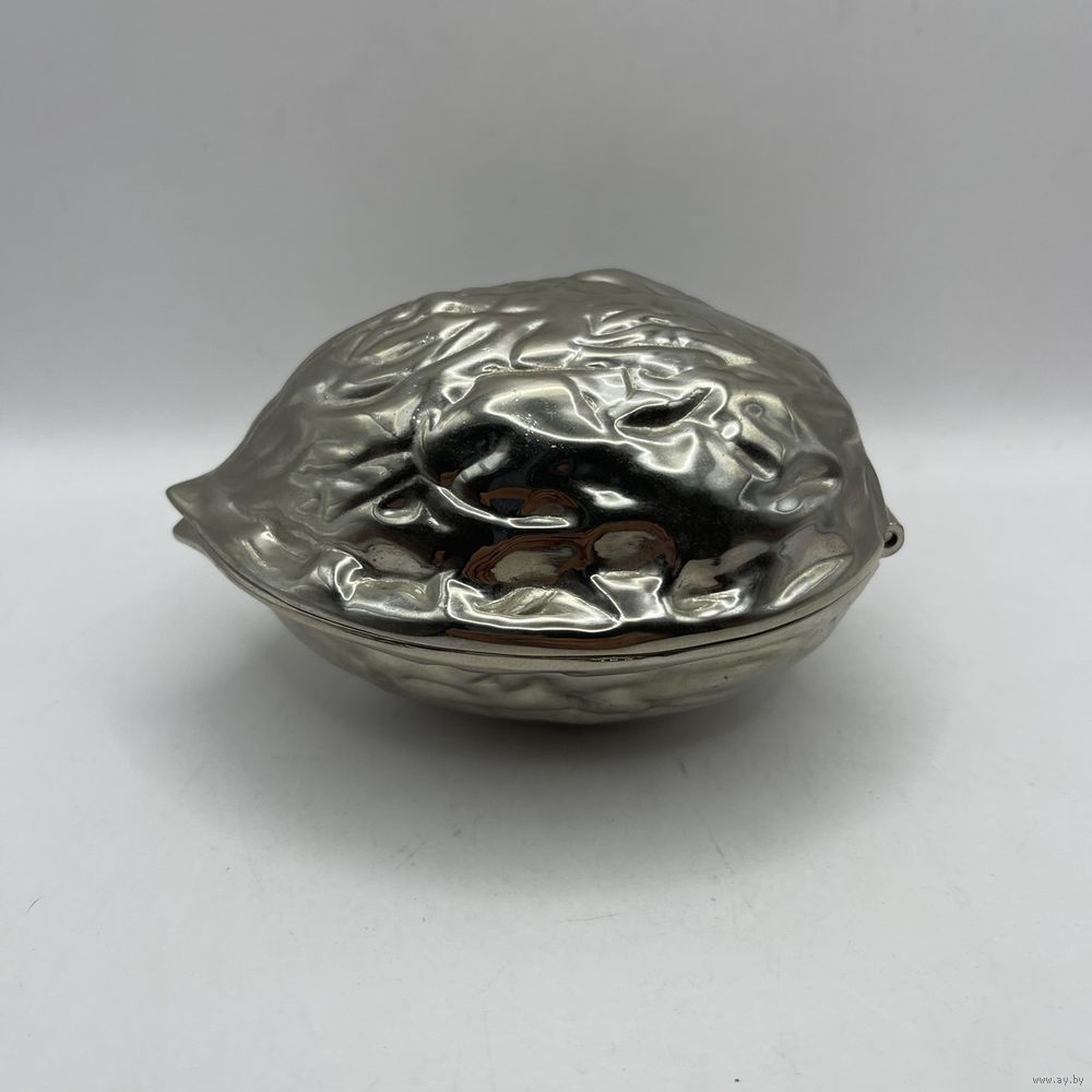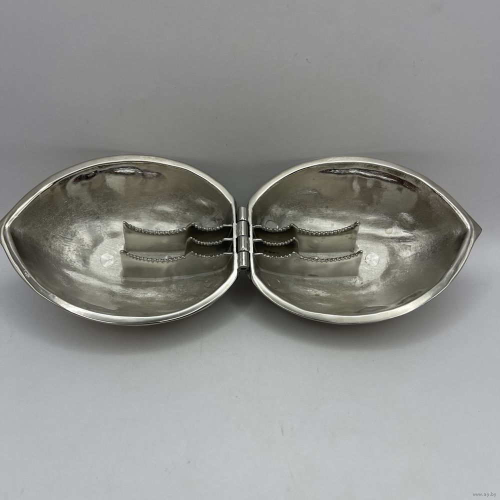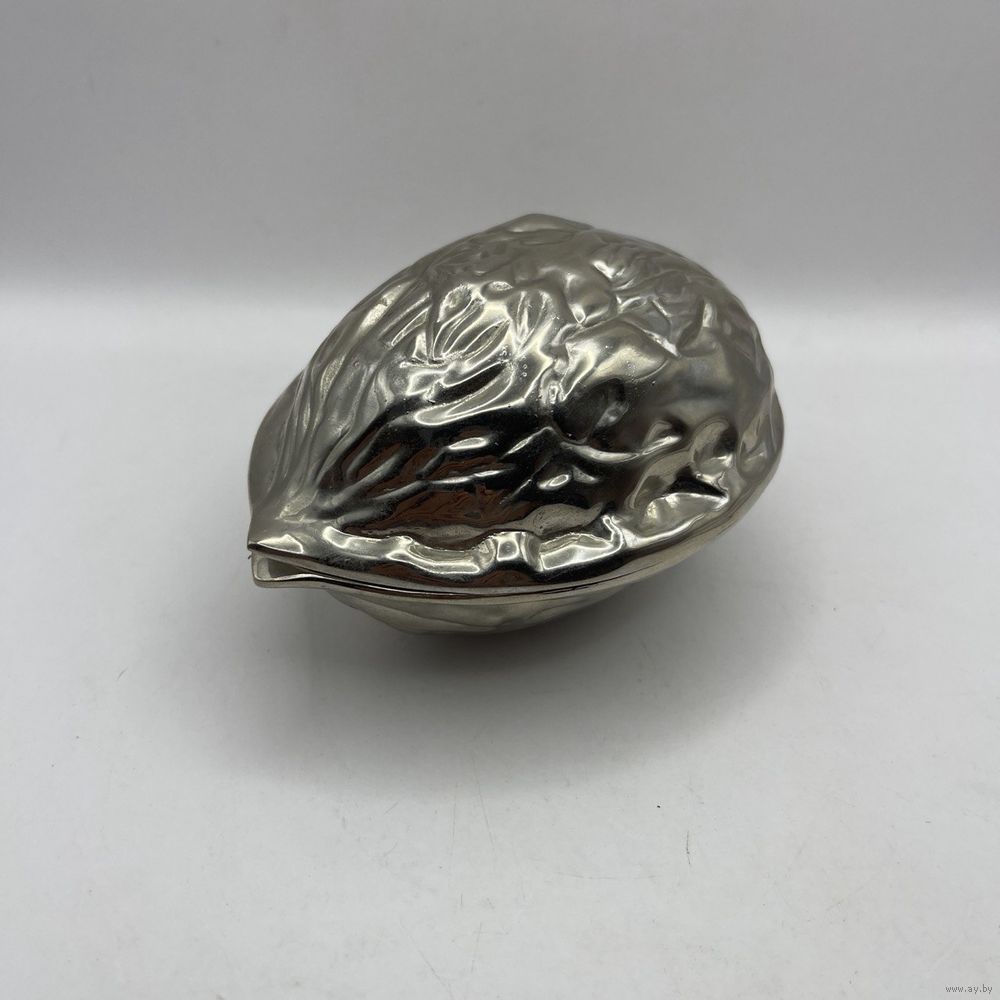 Антикварный металлический орехокол в форме ореха. Предназначен для колки грецких орехов. Простая конструкция в виде шкатулки с крышкой предохраняет от разброса скорлупы. Италия. 1950-е г.г. Размер 12 х 9 х 7 см. Состояние нового.
