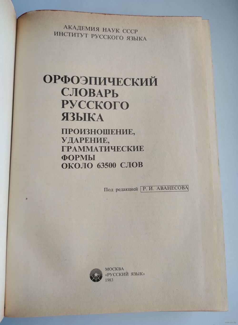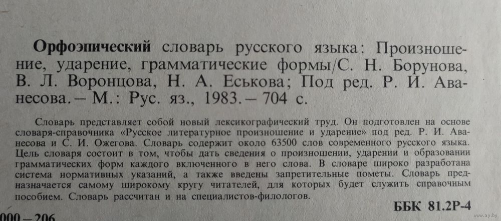 Борунова С., Воронцова В., Еськова Н. Орфоэпический словарь русского языка. Произношение, ударение, грамматические формы. Около 63500 слов. Москва: Русский язык, 1983г., 704 стр. Твёрдый переплёт. Увеличенный формат.
