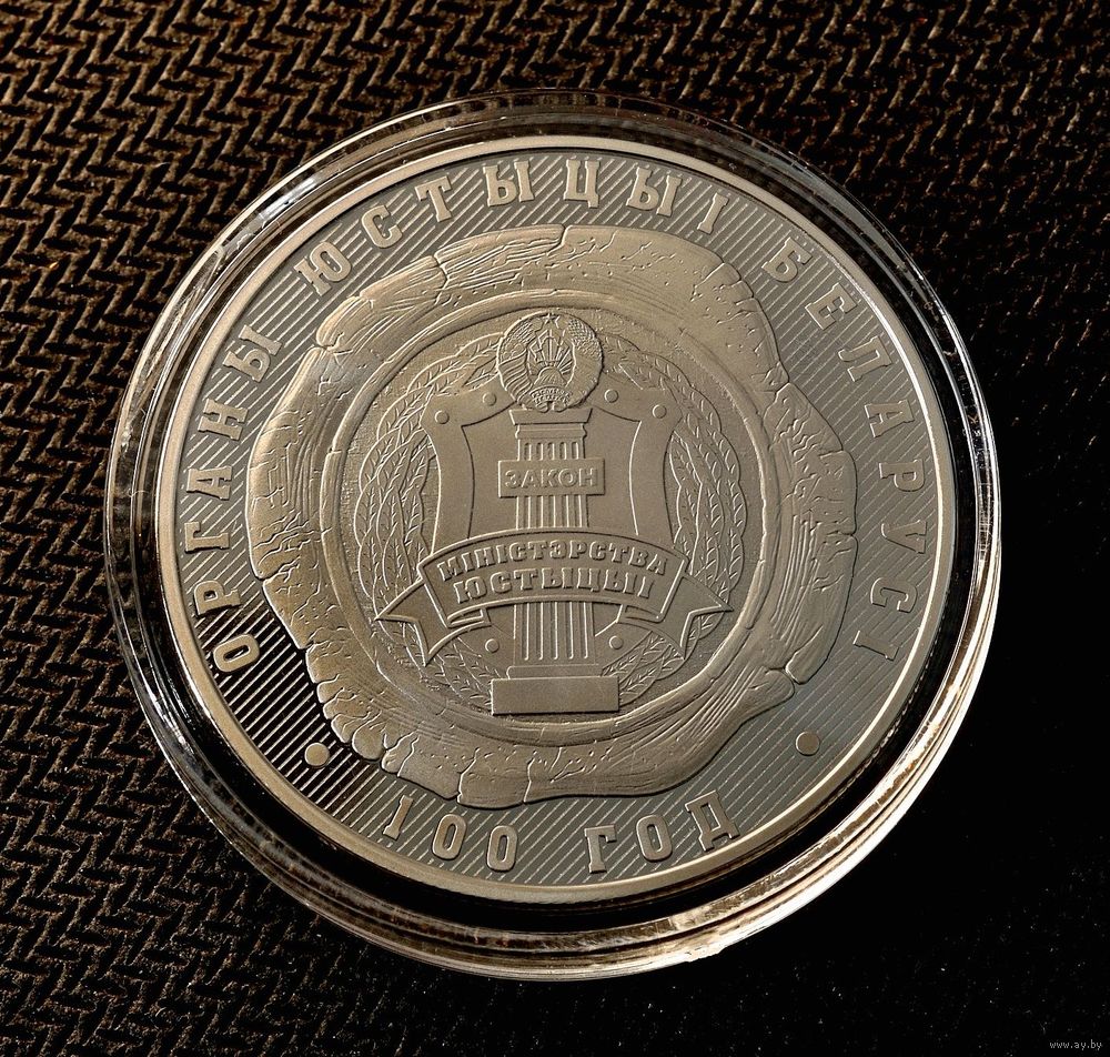 в центре на фоне стилизованного изображения печати геральдический знак-эмблема Министерства юстиции Республики Беларусь, по кругу надписи – ОРГАНЫ ЮСТЫЦЫI БЕЛАРУСI, 100 ГОД.