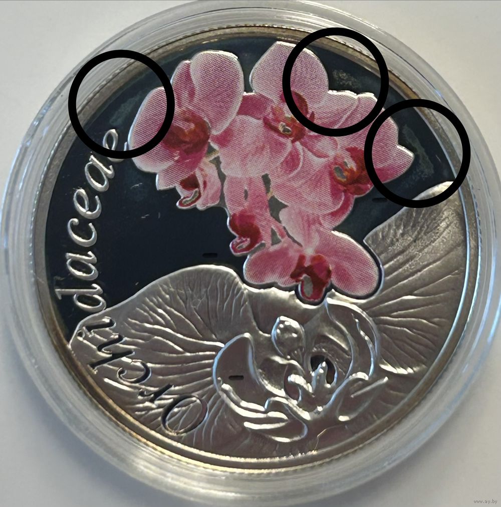На реверсе - незначительные пятна ( отмечены на фото).
