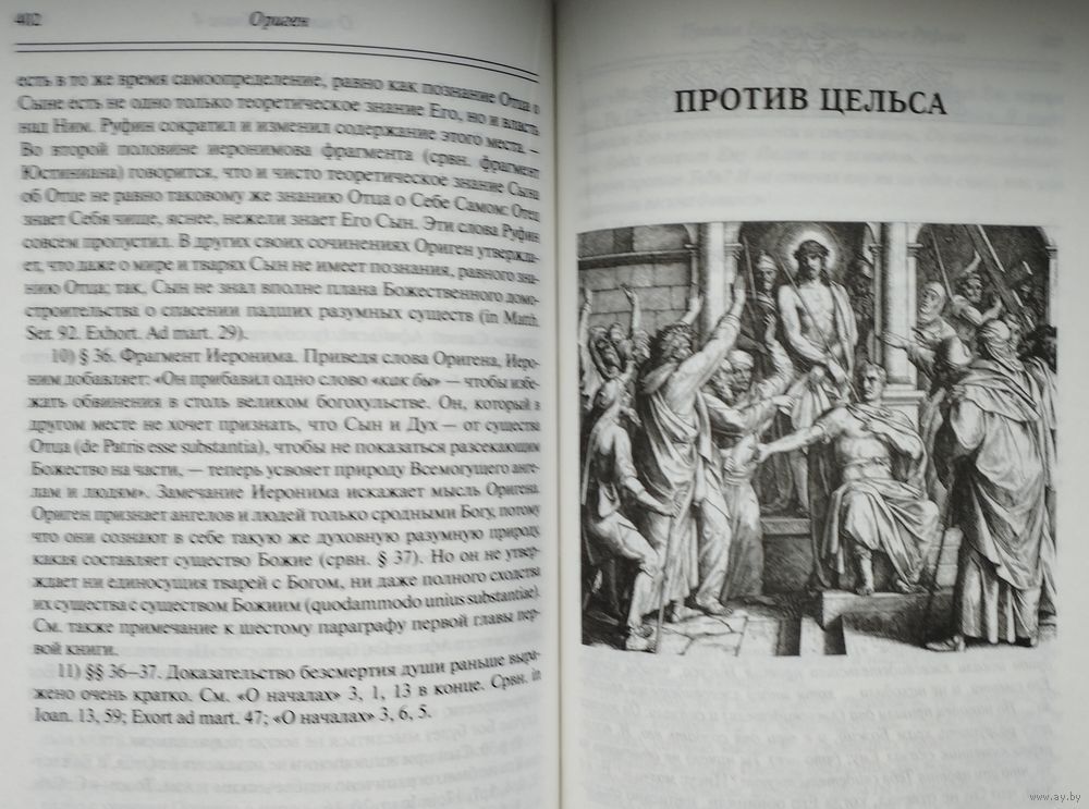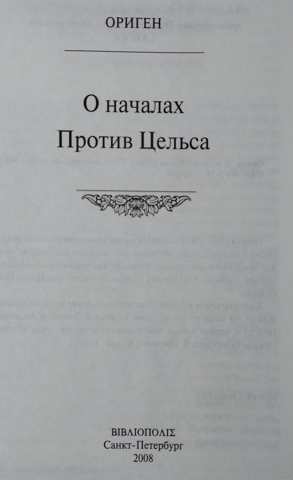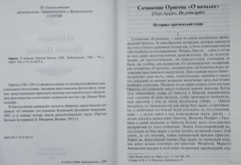 Большой формат. Тираж 3000 экз. 792 стр. Ориген (185-254 гг.) является одним из основоположников христианского богословия, «великим христианским философом, впервые представившим серьезную попытку систематического объяснения христианства в категориях эллинской мысли» (пр. Иоанн Мейендорф). В предлагаемом вниманию читателя сборнике представлены его трактат «О началах» (по изданию Казанской Духовной Академии, 1892 г.) и первые четыре книги апологетического труда «Против Цельса» (в переводе Л. Писарева, Казань, 1912 г.)