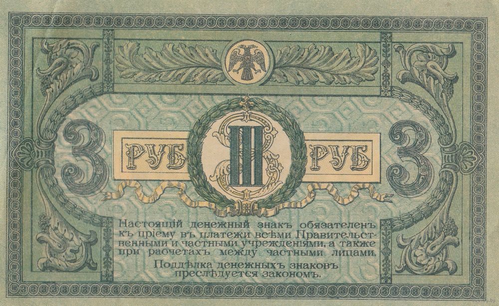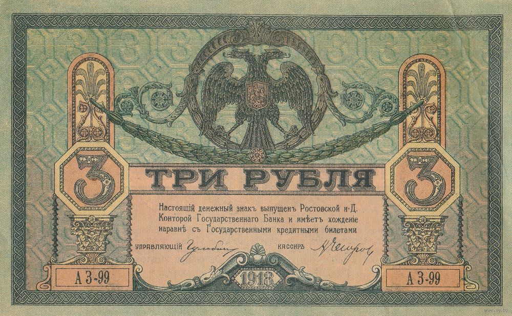 Оригинальная банкнота - 3 рубля 1918 года. Ростов. Смутное время. АЗ - 99