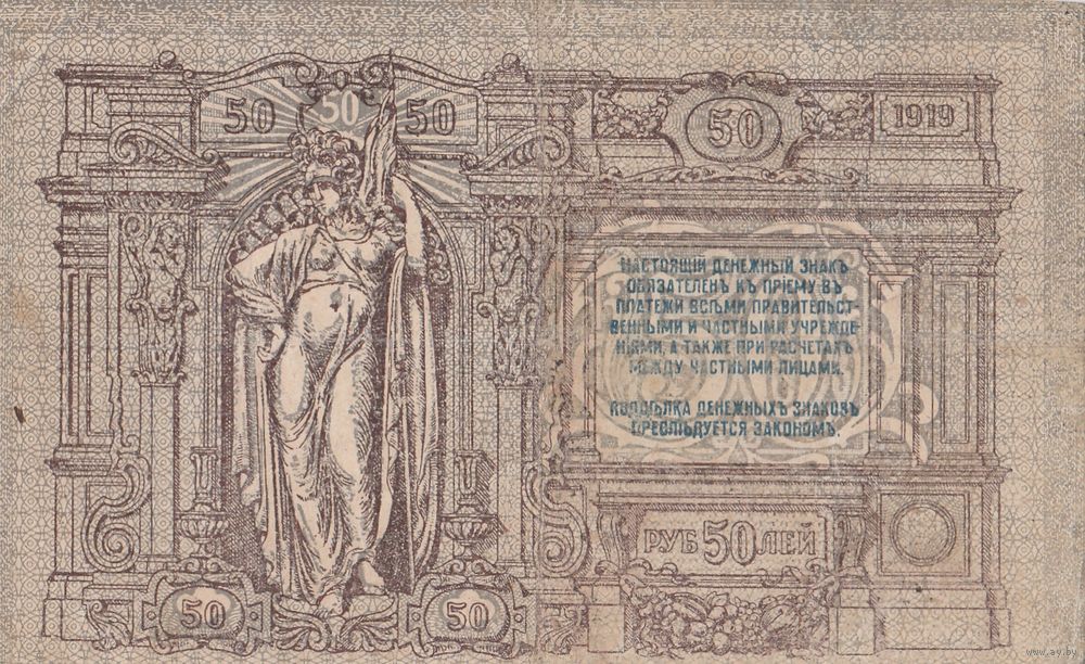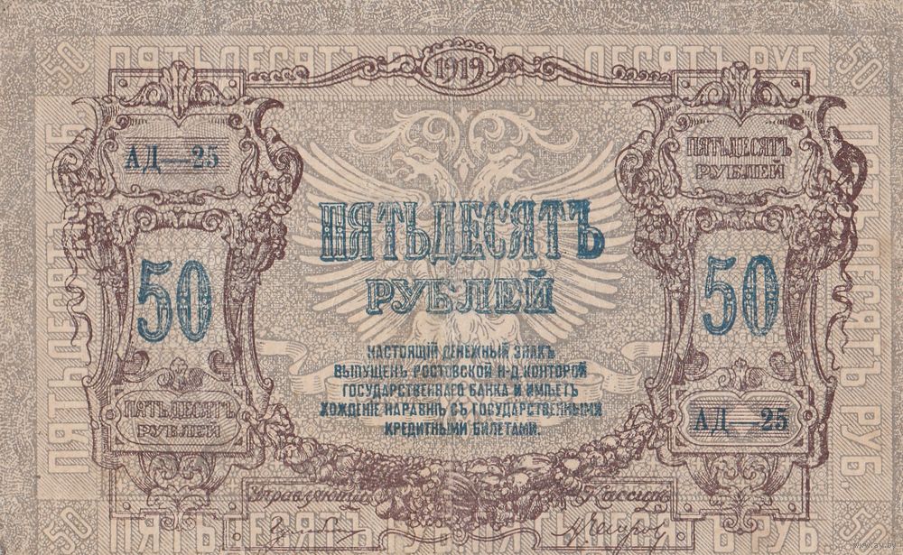 Оригинальная банкнота - 50 рублей 1919 года. Ростов. Смутное время. АД