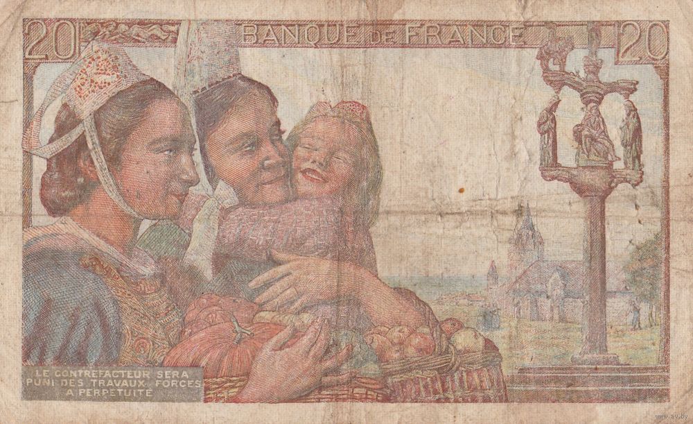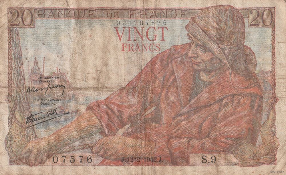 Оригинальная банкнота - Двадцать франков. Рыбак. 1940-ые
