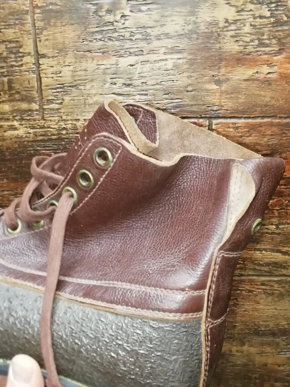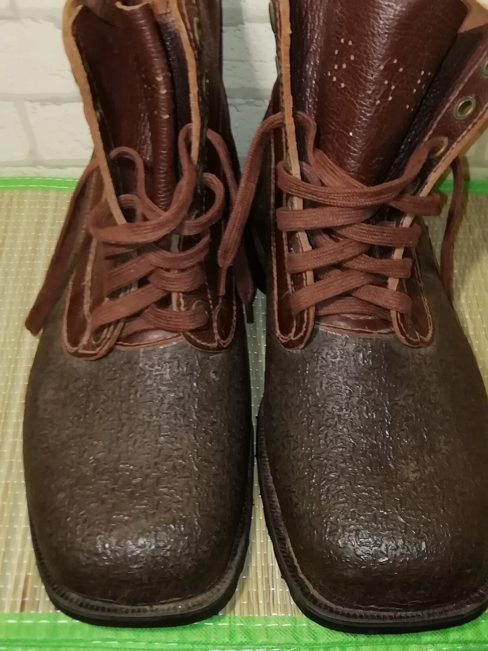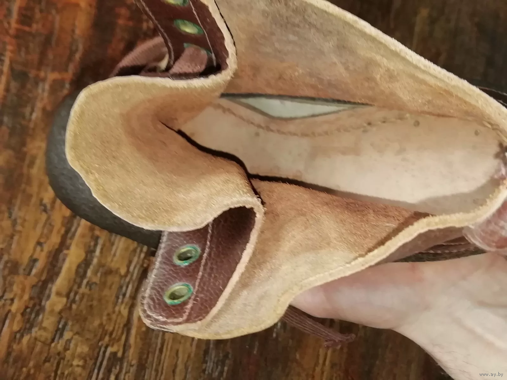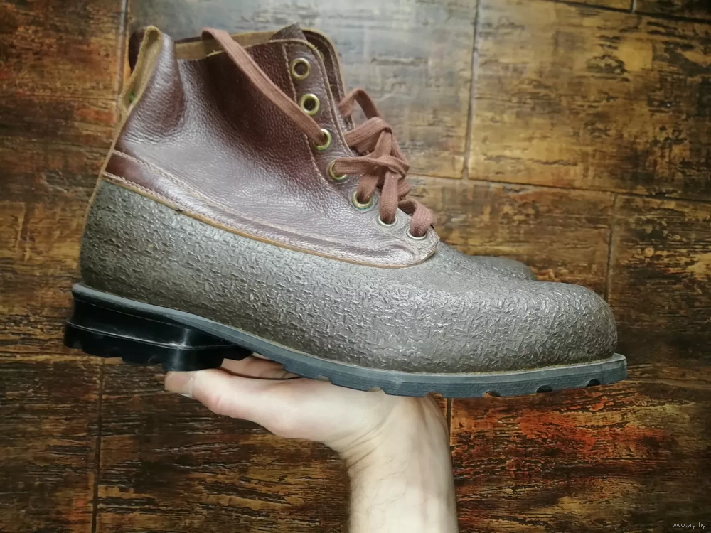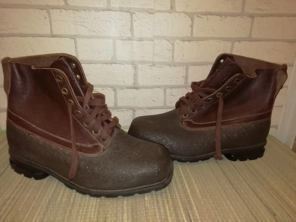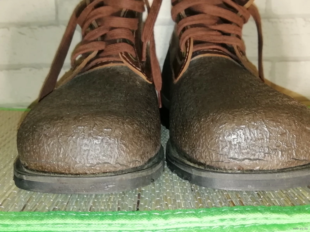 Плотная кожа. Верх кожи покрыт резиновой защитной подкладкой. На носке есть горизонтальные трещины от высыхания. Смотрите фото! Если нужны дополнительные фотографии, пожалуйста напишите . Брендовый. Прошитая подошва. Очень прочные. Идеально подходят для строительства. Тяжелые. 975 грамм каждая туфля. Коричневый цвет. Два оттенка. Чистые.