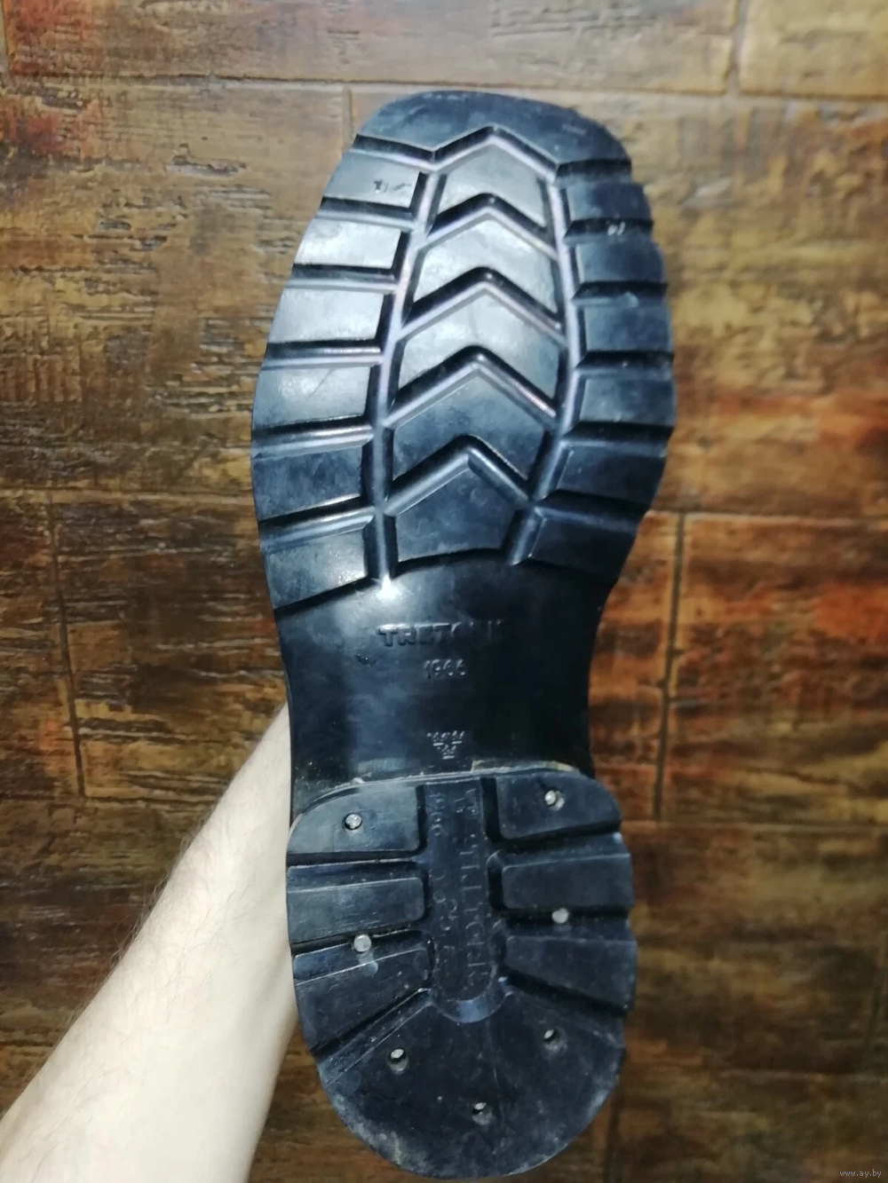 Подошва шведских ботинок модели M/59, коричнево-черная, кожаная, к которой приклеена и пришита резиновая защита TRETORN, каблук дополнительно подбит гвоздями для обуви.