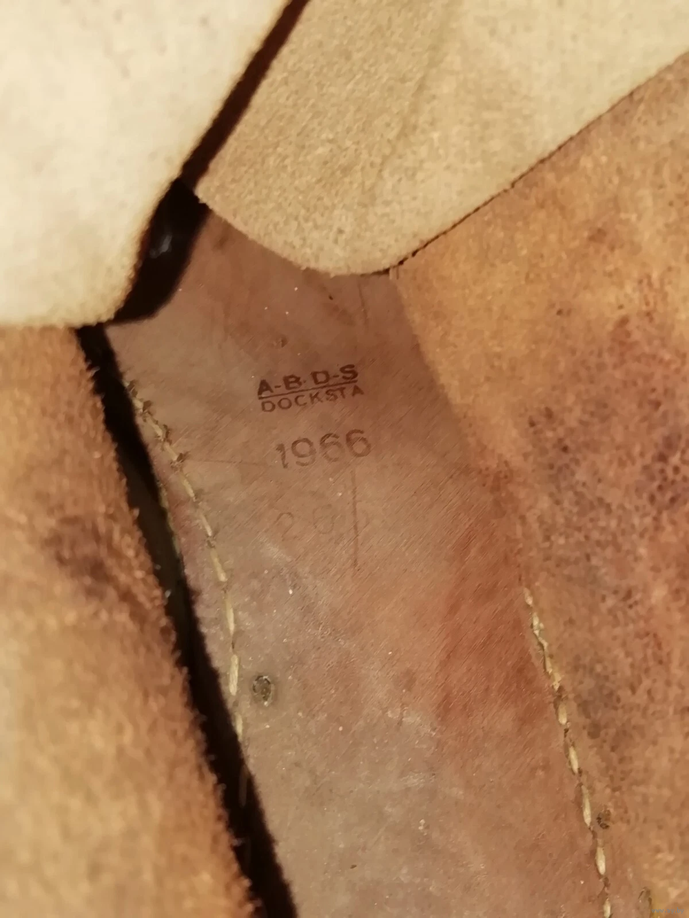 На коричневых туфлях 1960-х годов на внутренней стельке часто дублировались данные о производителе (например, A.B.D.S. Docksta), годе производства (например, 1964) и размере в миллиметрах (система Мондопоинт)