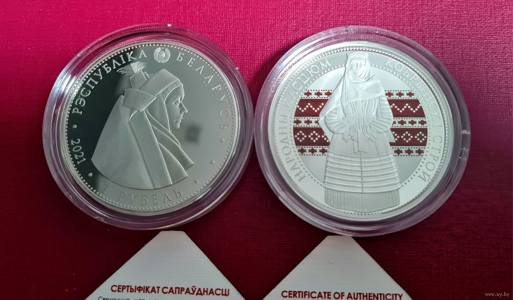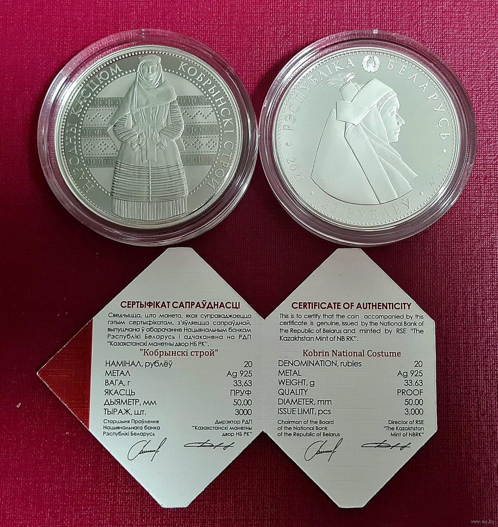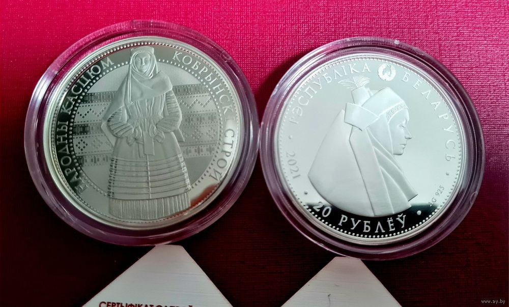 по кругу вверху – рельефное изображение Государственного герба Республики Беларусь и надпись: РЭСПУБЛІКА БЕЛАРУСЬ; в центре изображение элементов национального белорусского костюма; внизу – номинал 20 РУБЛЁЎ, слева – проба сплава, справа ‒ год чеканки.