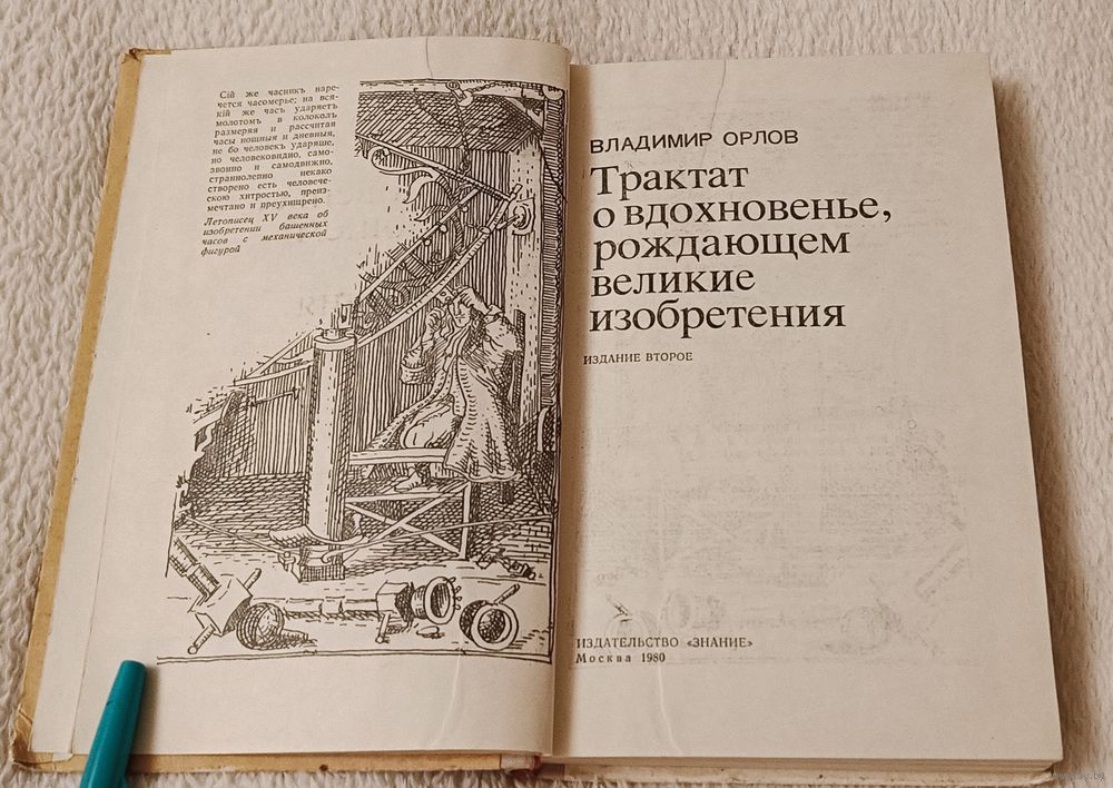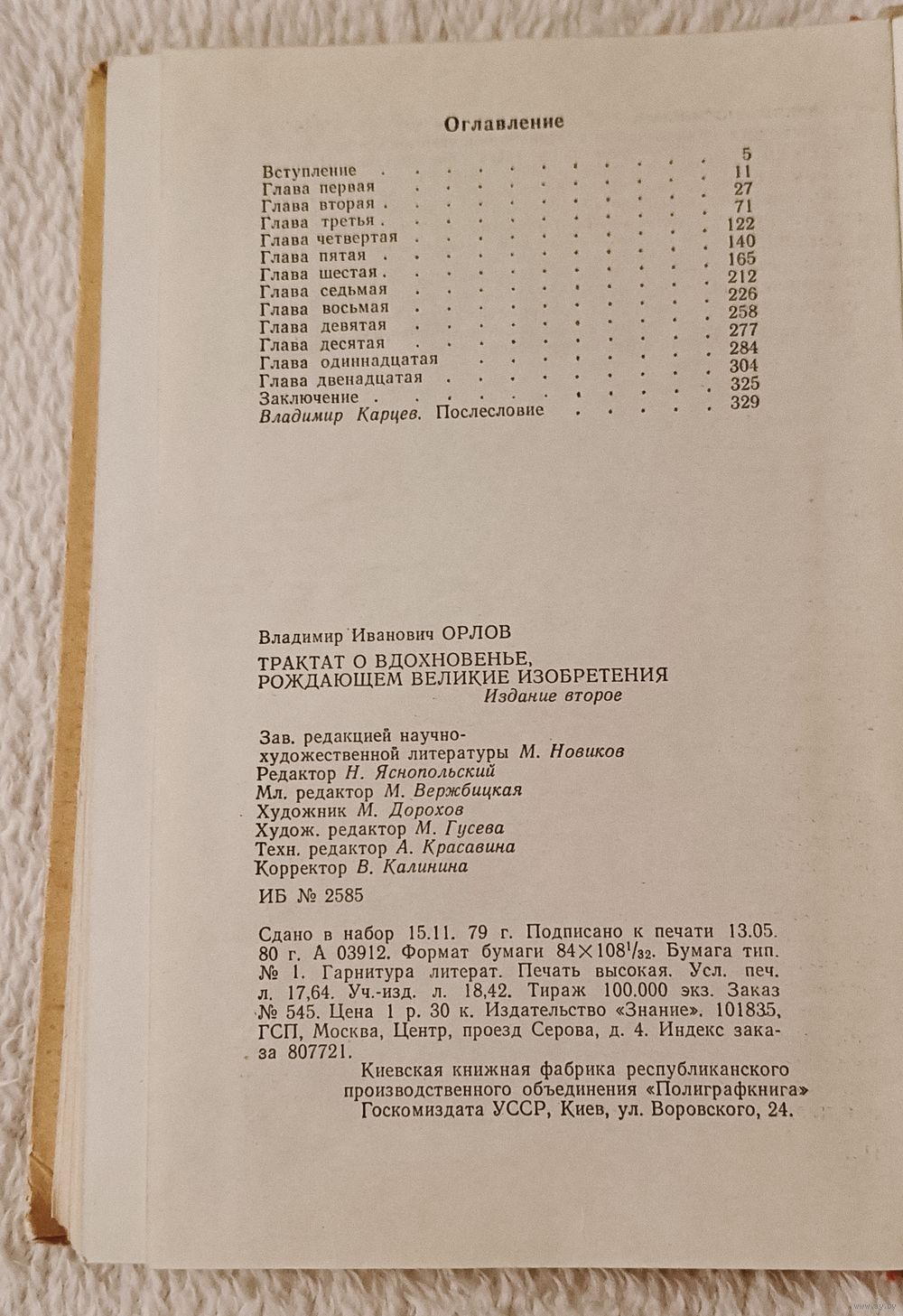 Орлов Владимир. Трактат о вдохновенье, рождающем великие изобретения. Изд. 2-е. М., «Знание», 1980. 336 с. (Библиотека «Знание»), твёрдый переплёт, обычный формат.