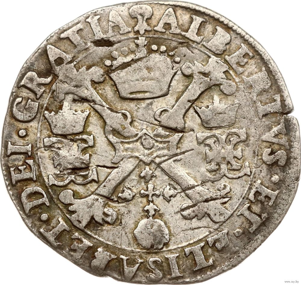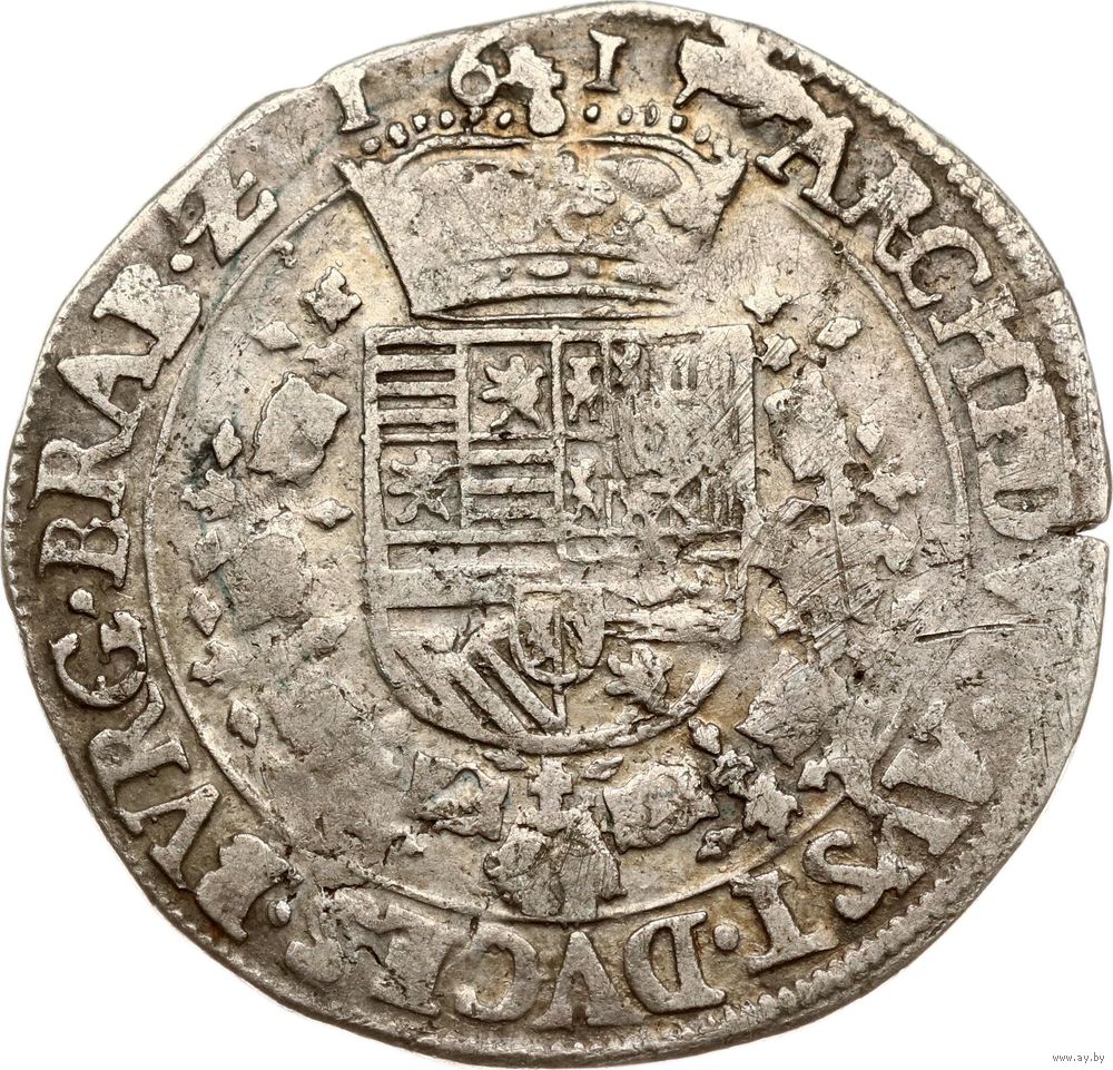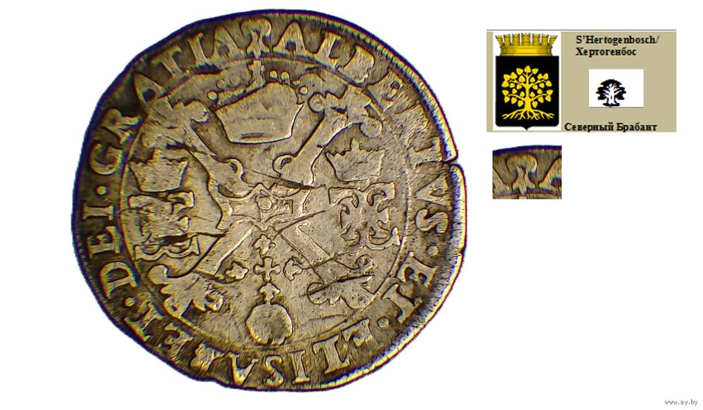 Хертогенбос, столица провинции Северный Брабант.Монетный двор города производил ограниченную чеканку альбертусдальдеров/патагонов в 1614-21. Знак монетного двора - дерево. Spanish Netherlands. Albert & Isabella (1598-1621). 1/4 Patagon 1617 Brabant, S-Hertogenbosch. Albert & Isabella (1598-1621). (Bois-le-Duc). Nicely preserved for this type. Silver 6.70 g. Vanhoudt 621.SH (R1) (CNM 2.08.30 / vGH 313-4b / Delmonte. 270 )