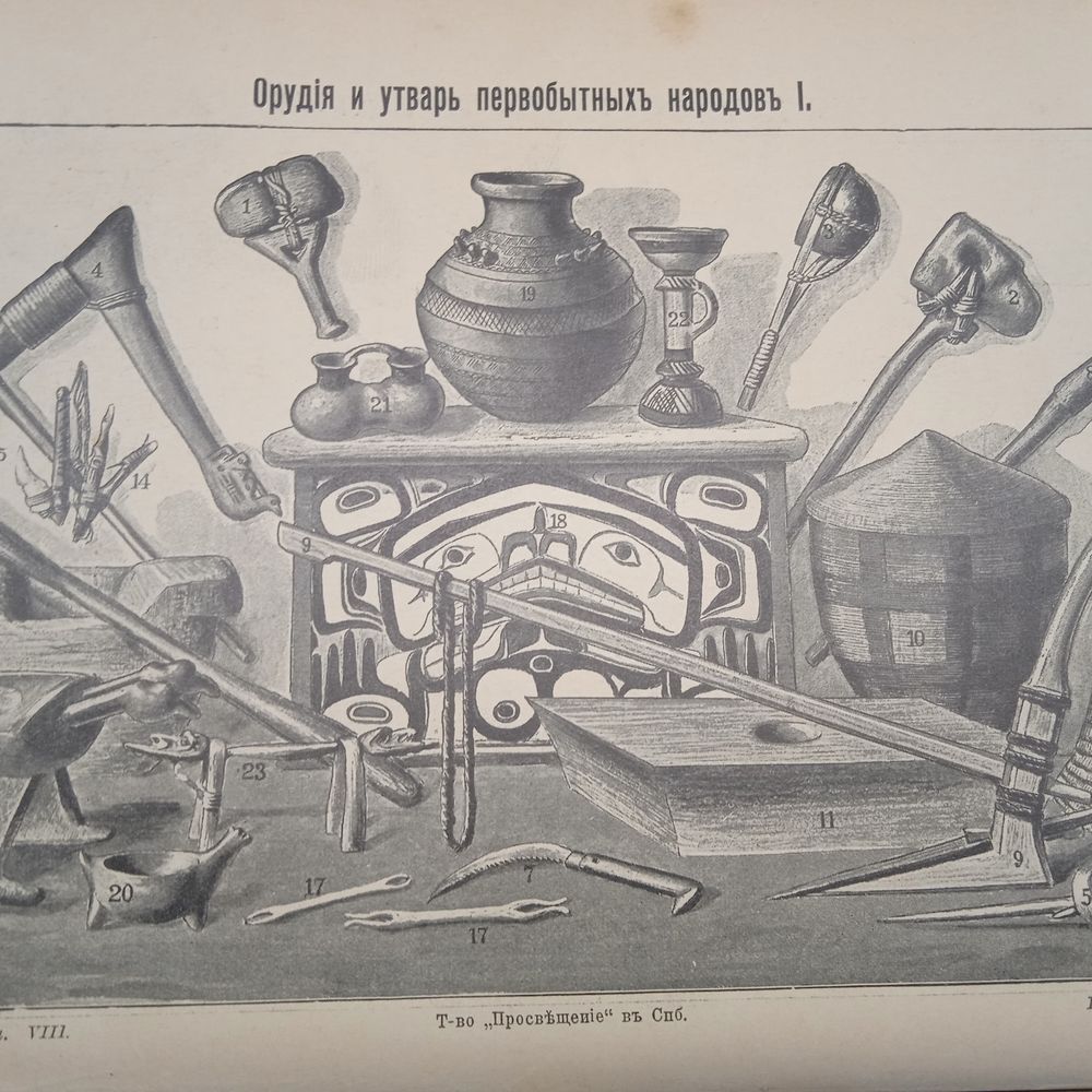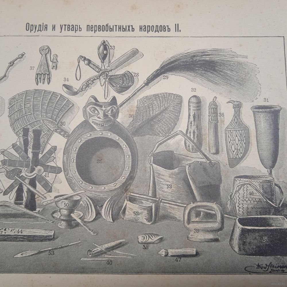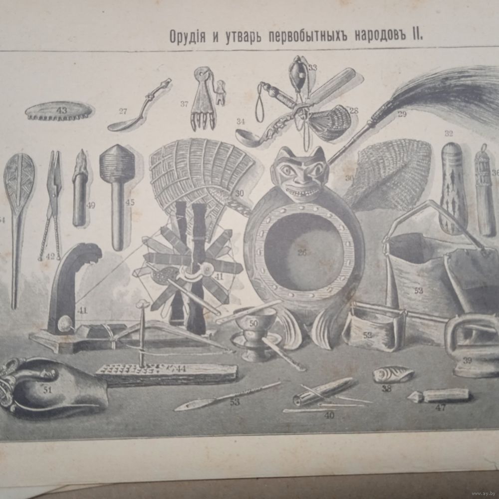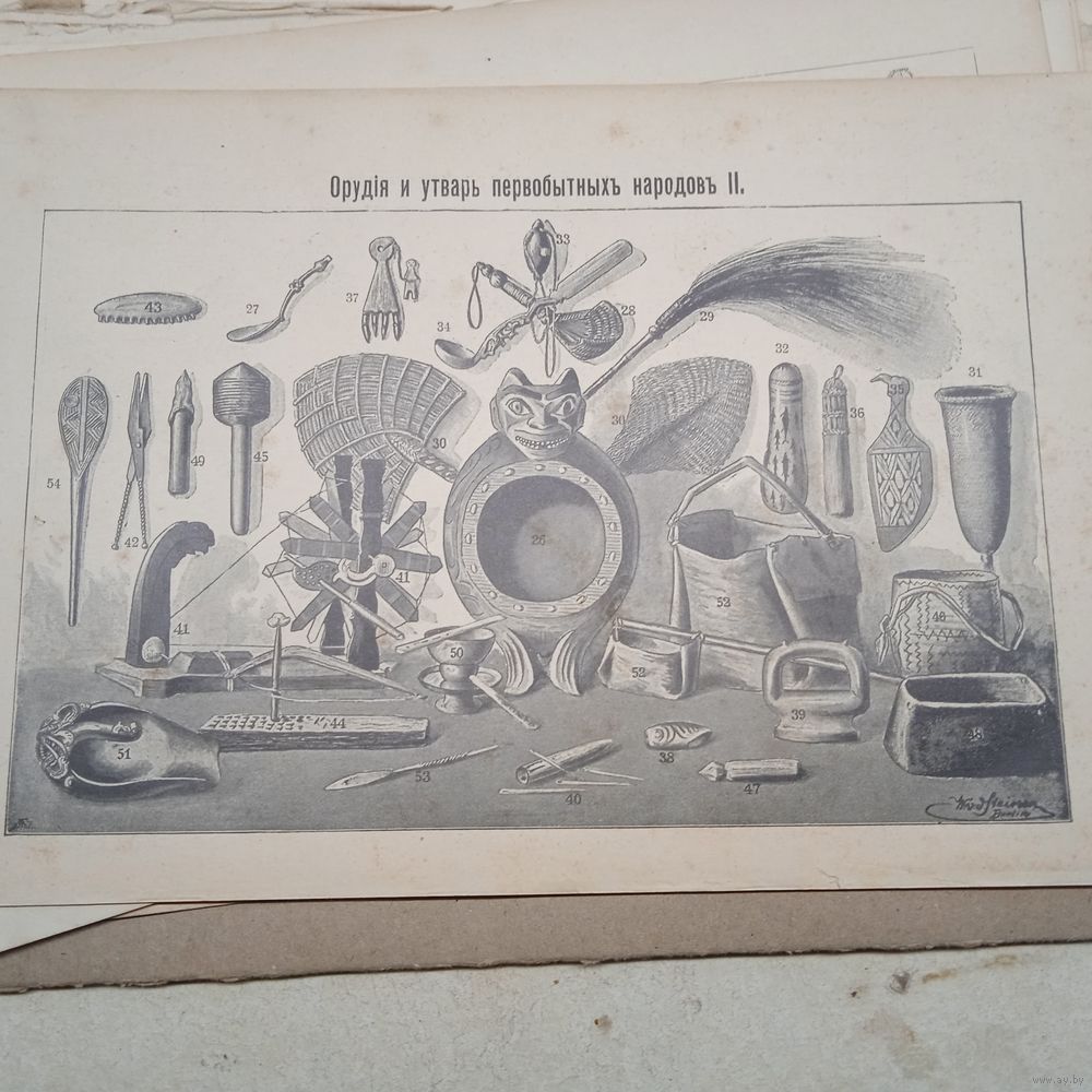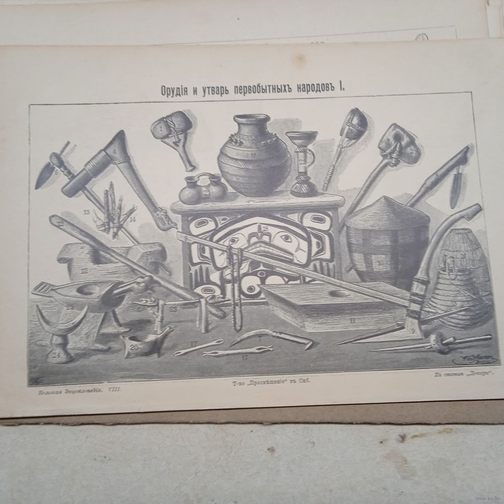 Орудия и утварь первобытных народов. Энциклопедическая гравюра СПБ. 19-20века .24х17см