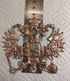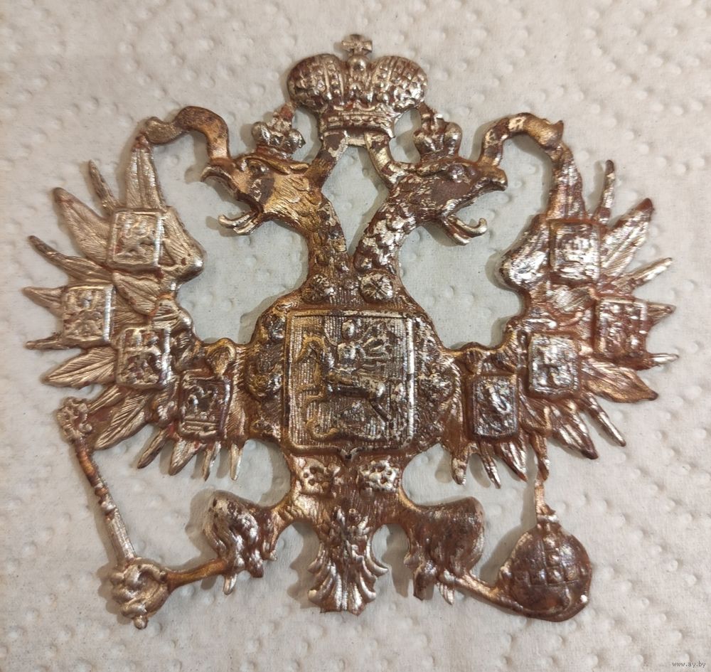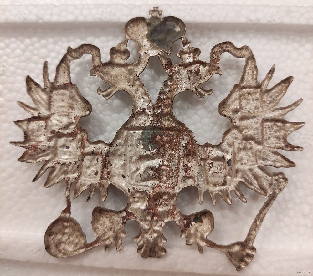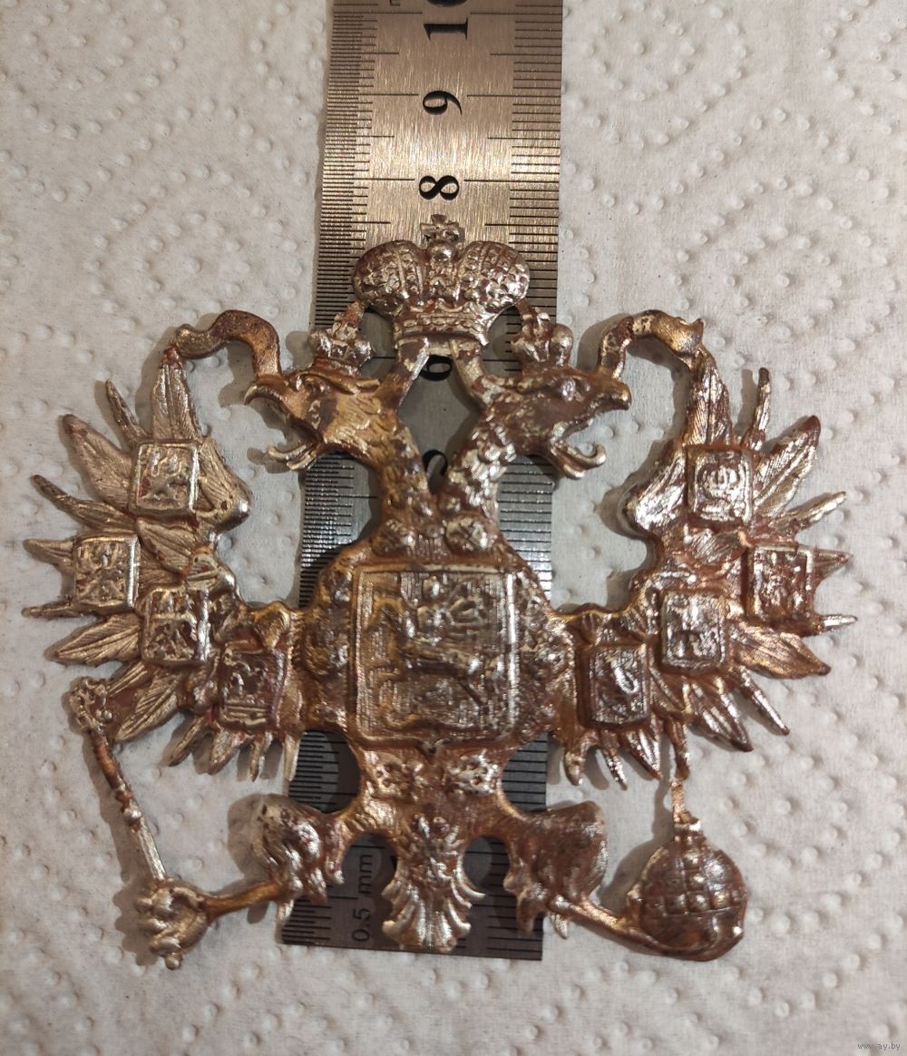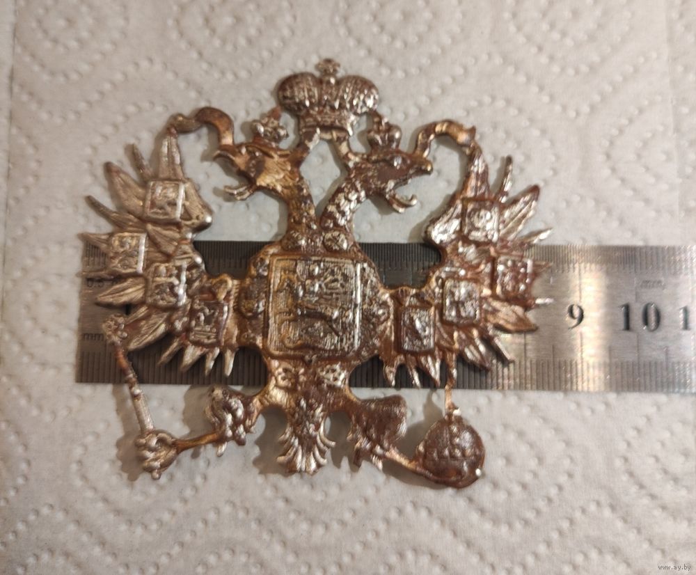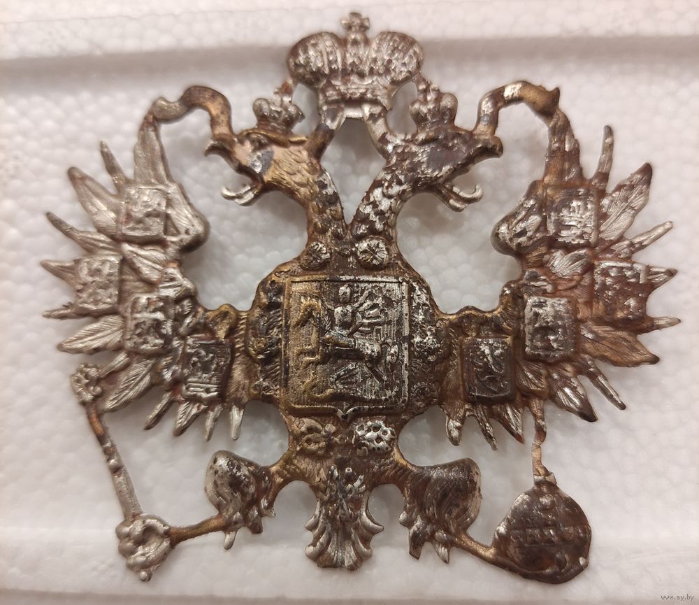 Добрый день. Вашему вниманию предлагается оригинальная посеребренная кокарда в виде двуглавого орла Российской Империи, возможно на парадный штабс-офицерский кивер образца 1909-1917 г.г. полковника генерального штаба. Данный факт утверждать не стану, возможно у вас окажется более достоверная информация.