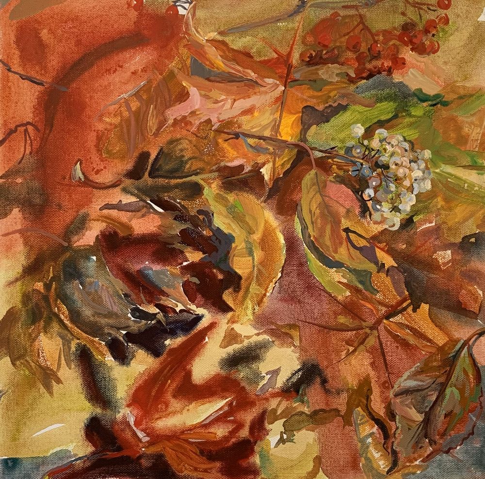 работа выполнена на холсте акрилом, на подрамнике, без рамы, осенний букет листьев, золотая осень