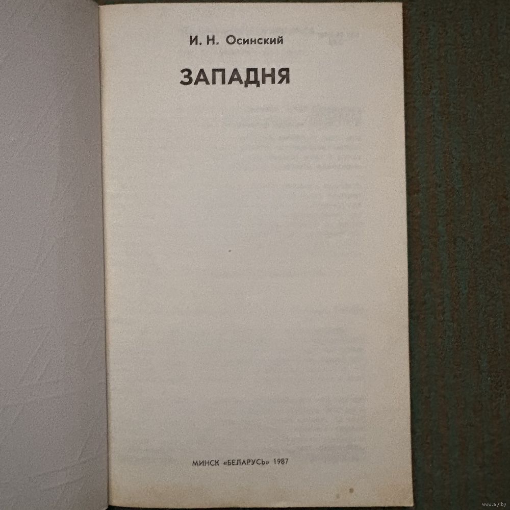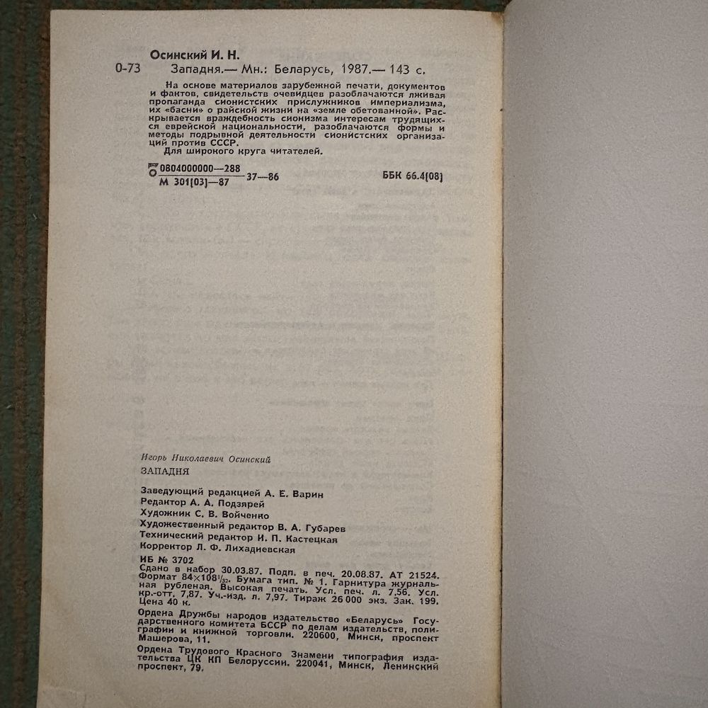 Осинский И. Н.Западня.- Мн.: Беларусь, 1987.- 143 с.На основе материалов зарубежной печати, документов и фактов, свидетельств очевидцев разоблачаются лживая пропаганда снонистских прислужников империализма, их «басни» о райской жизни на «земле обетованной». Раскрывается враждебность сионизма интересам трудящихся еврейской национальности, разоблачаются формы и методы подрывной деятельности сионистских организаций против СССР.Для широкого круга читателей.Ордена Дружбы народов издательство «Беларусь» Государственного комитета БССР г по делам издательств, полиграфии и книжной торговли, 220600, Минск, проспект Машерова, 11.Издательство Минск "Беларусь" 1987г.
