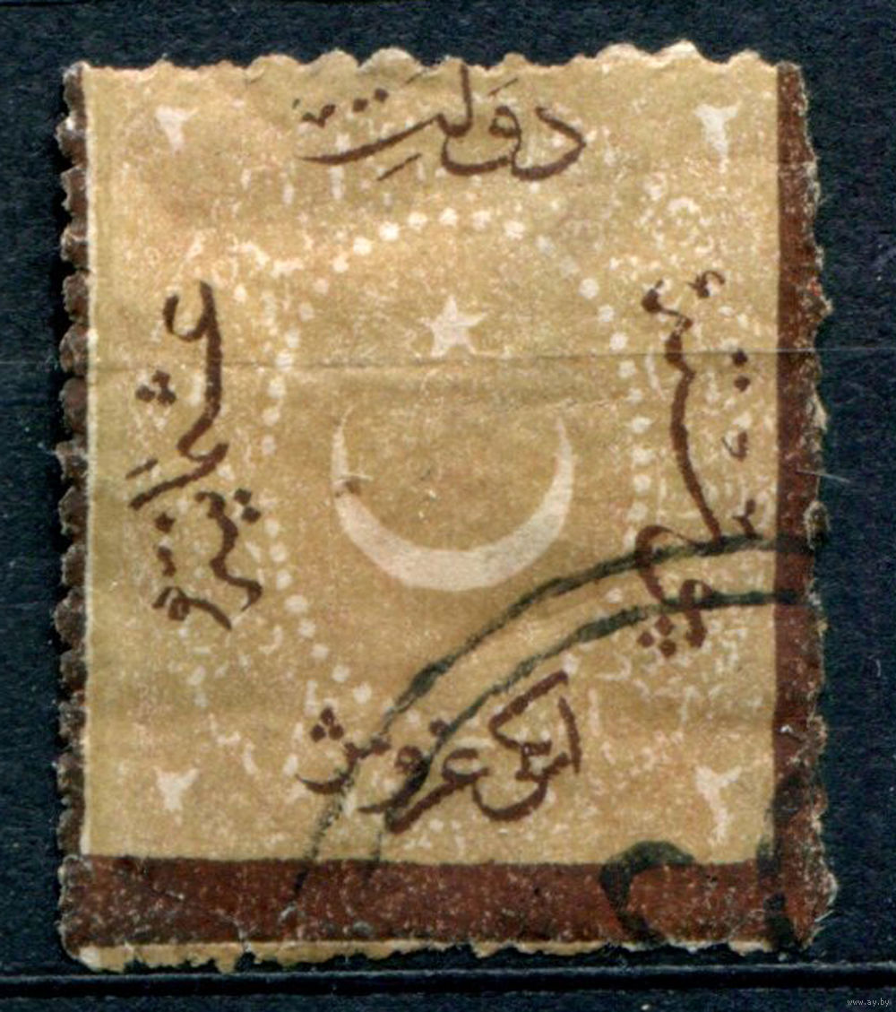 Османская Империя (Турция) - 1869г. - полумесяц и звезда, доплатные марки (portomarken), перфорация 13:14, 2 Ghr - 1 марка - гашёная, есть сгиб, сильно повреждён уголок [Mi 13 b]. #4-W2-122-A-1