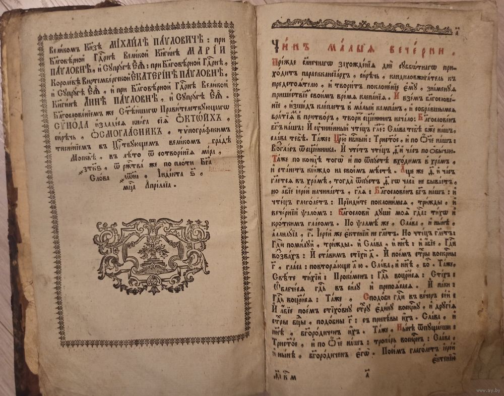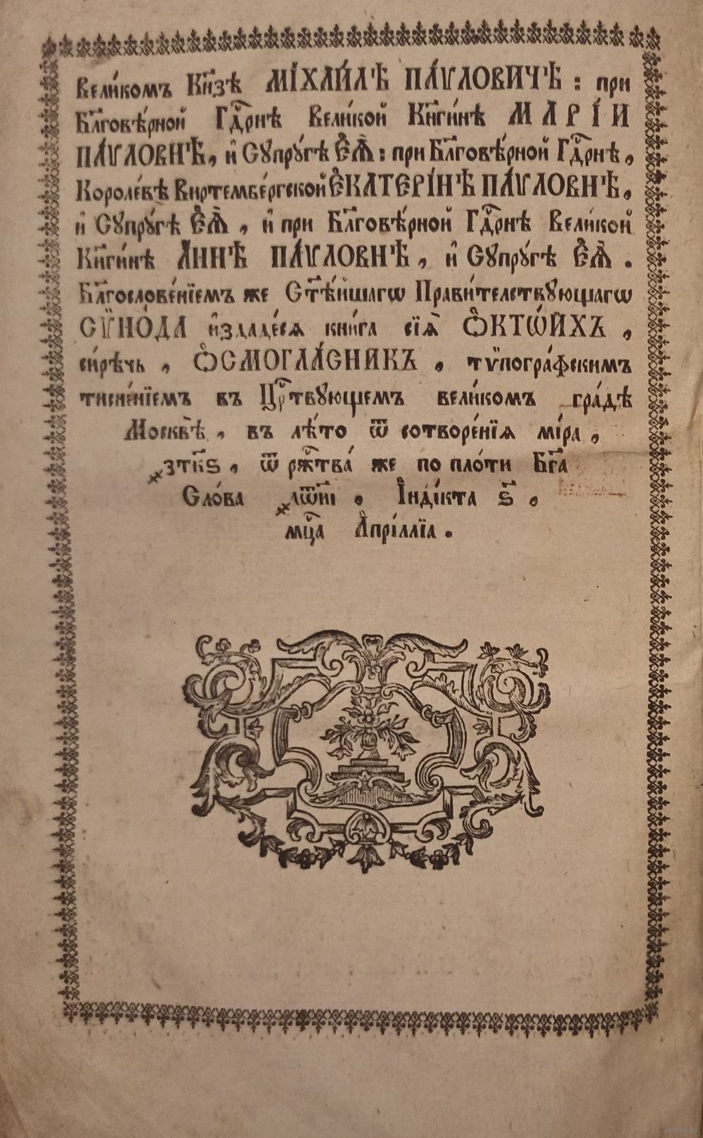 Благословением же Святейшего Правительствующего СИНОДА ИЗДАНА КНИГА СИЯ ОКТИХ, сиречь, ОСМОГЛАСНИК.