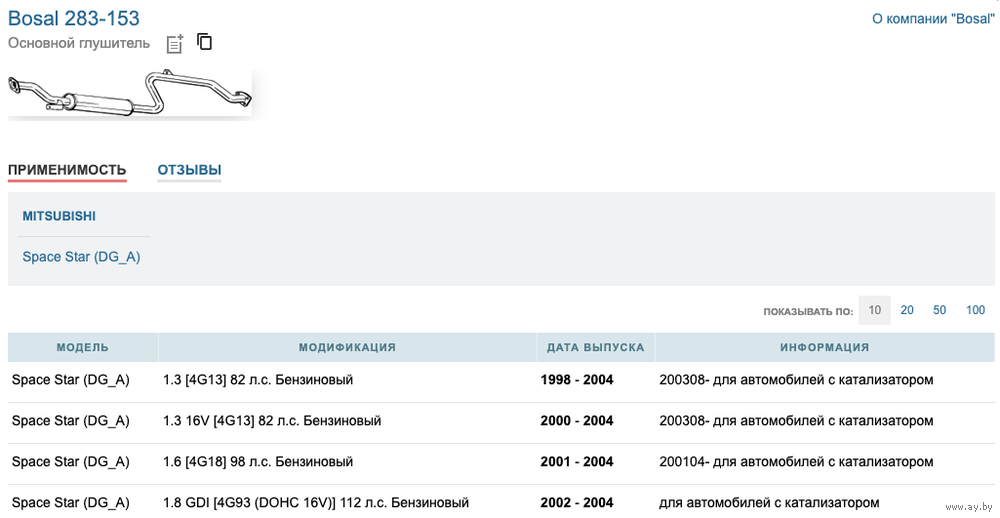 Основной глушитель Bosal 283-153 (аналог средней выхлопной трубы Mitsubishi MR 464956) с креплением подвески глушителя MR 266292 (2шт). ПРИМЕНИМОСТЬ MITSUBISHI Space Star (DG_A)