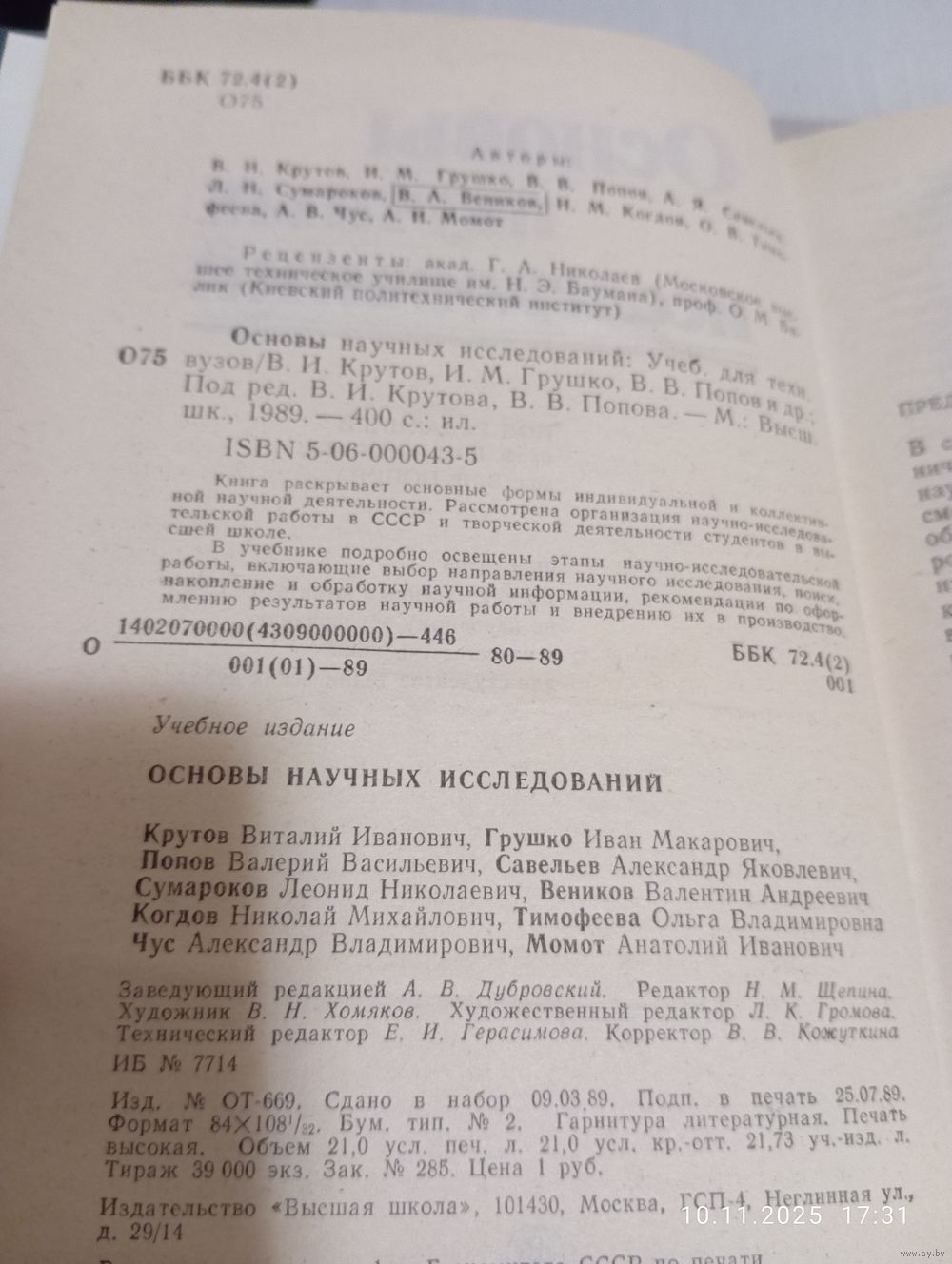Основы научных исследований. Учебник для вузов. М. Высшая школа 1989. В хорошем состоянии, тв переплет. 400 с. Илл. Возможность отправки Белпочтой, полная предоплата