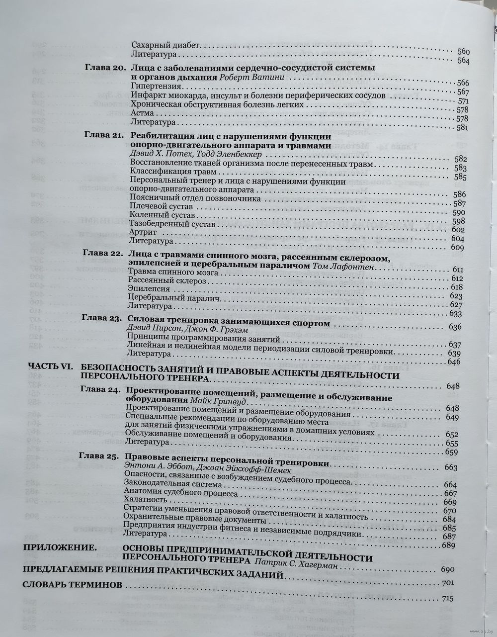 В написании данного пособия принимали участие известные персональные фитнес-тренеры, которые провели тщательный анализ теоретической и практической информации, знаний и качеств, необходимых компетентному персональному фитнес-тренеру. Изложены научно-теоретические основы персональной тренировки, приведена базовая информация об анатомии и физиологии двигательной активности, даны рекомендации по правильному питанию. Представлены безопасная и эффективная методика занятий физическими упражнениями, методики обучения выполнению упражнений для развития гибкости, силовых, аэробных и др. Даны примеры занятий с группами лиц, имеющих специфические потребности (дети, подростки, женщины в период беременности, люди пожилого возраста и др.). Рассмотрены важнейшие правовые вопросы, о которых должен иметь представление персональный тренер.