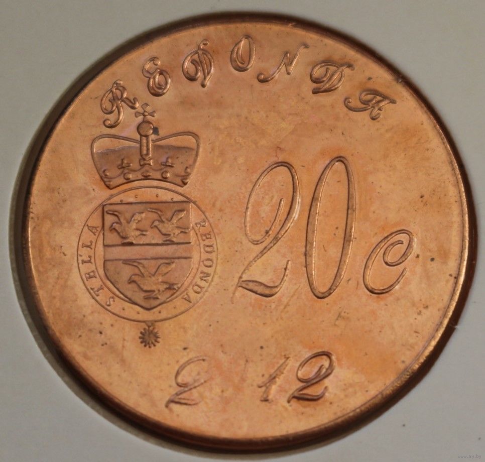 Это монета Королевства Редонда достоинством 20 центов. Выпущена в 2012 году в ознаменование 100-й годовщины гибели «Титаника». Изготовлена из меди. На аверсе изображен герб Редонды и год выпуска.