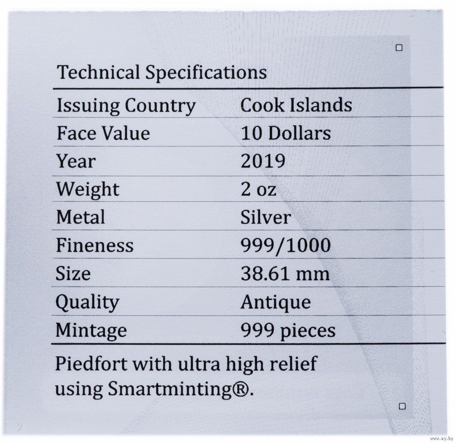 Детализация и высокий рельеф монеты достигнут благодаря применению уникальной технологии чеканки Smartminting.